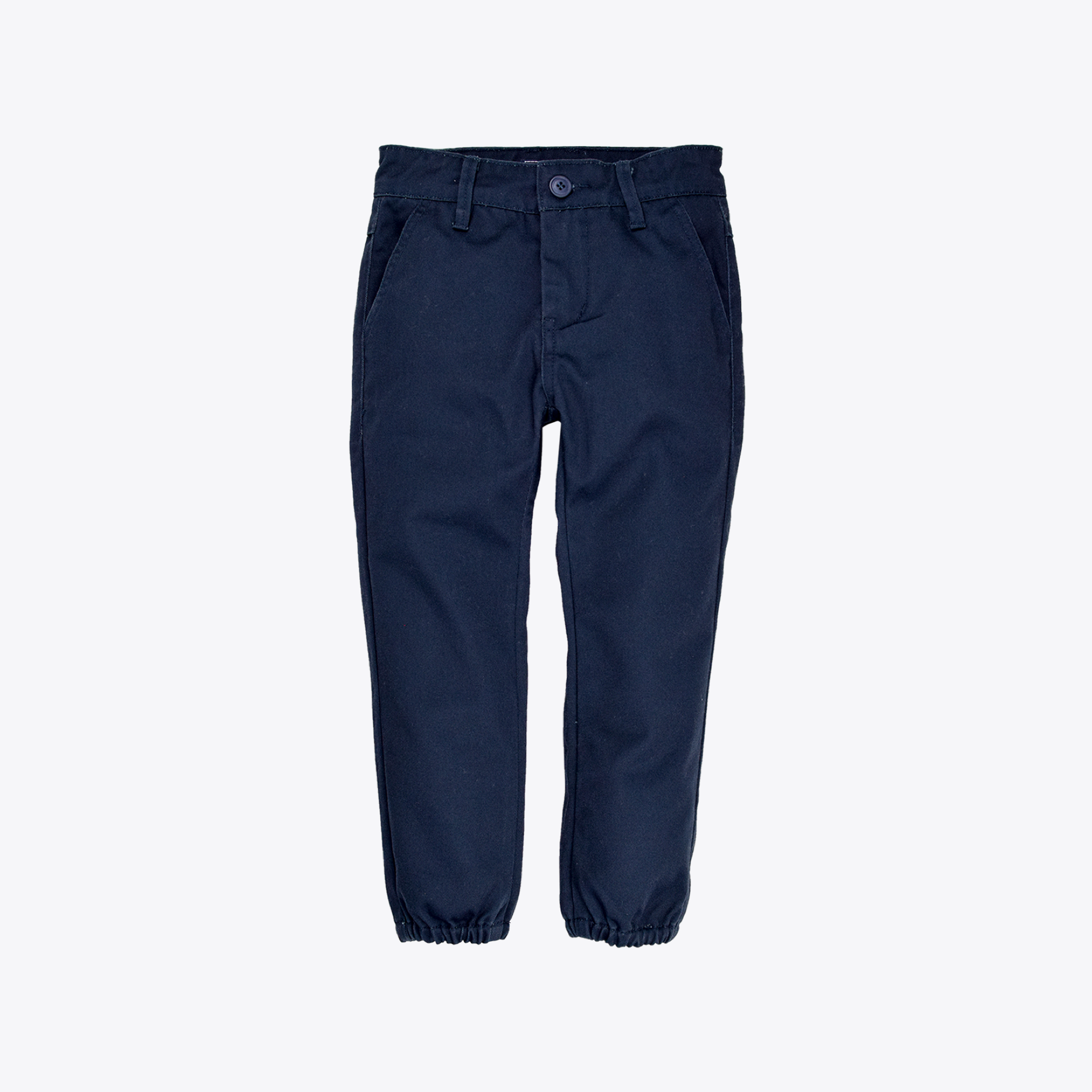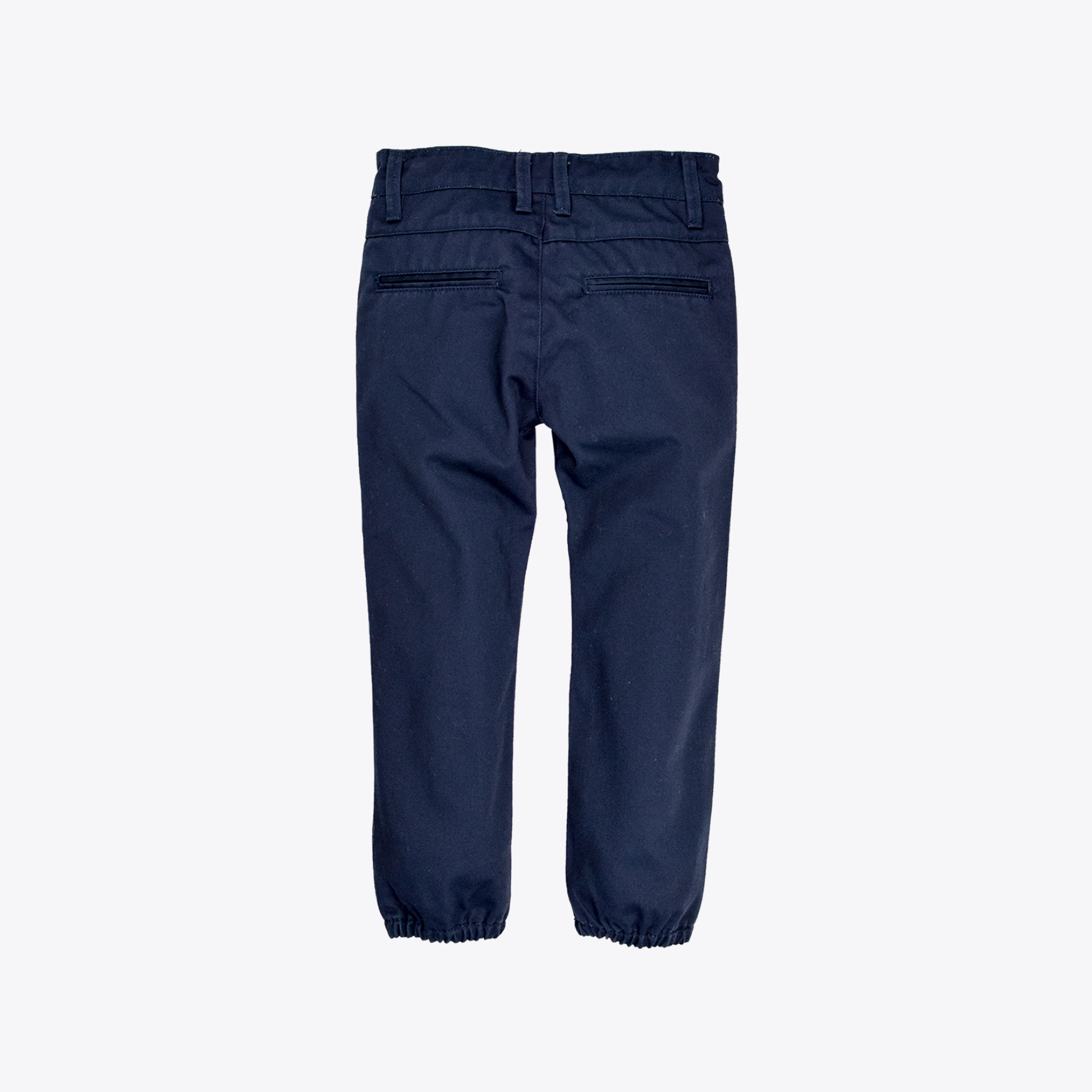 NEW! Our signature cool fit chinos have a regular slim fit with elastic bands around the ankles for a modern look. Adjustable waist band. Zipper with regular button and 4 full pockets. Dark navy is a great neutral to pair with everything! Created in a 100% cotton. Machine washable. Style # J40105