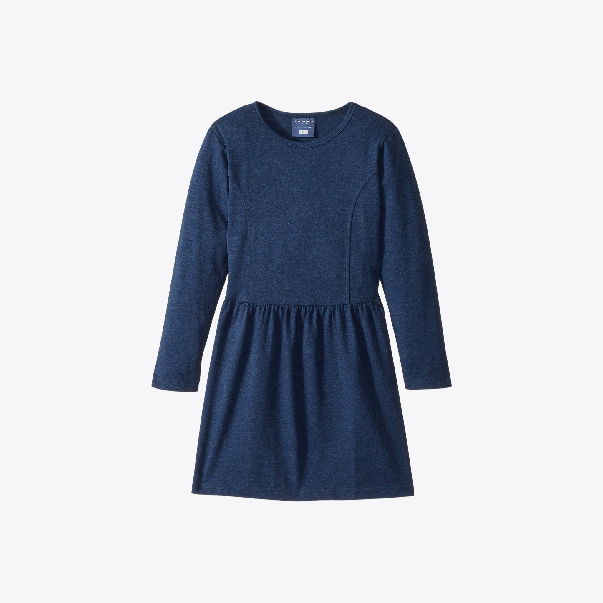 The essential dress for the girl on the go. Versatile skater style dress in a super soft cotton with a touch of stretch. Heather navy blue pink color, long sleeve, pleated skirt. Machine washable. Style # M20425