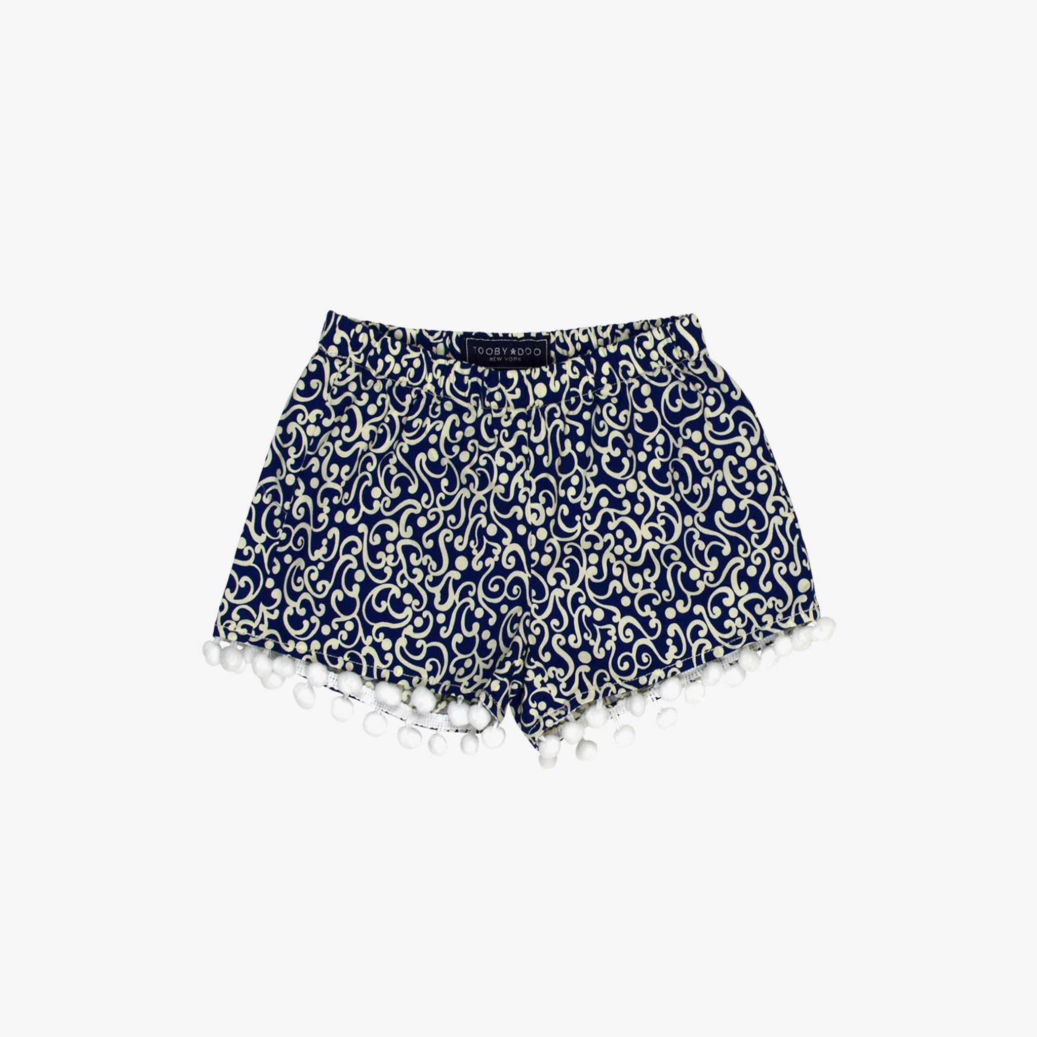 The perfect summer shorts for your stylish little lady. Soft woven cotton fabric boasts a striking print with soft white and navy. Fun white pom polos at the hem complete this look Light and airy, created in 100% cotton. Machine wash cold, tumble dry low. Style # M40073
