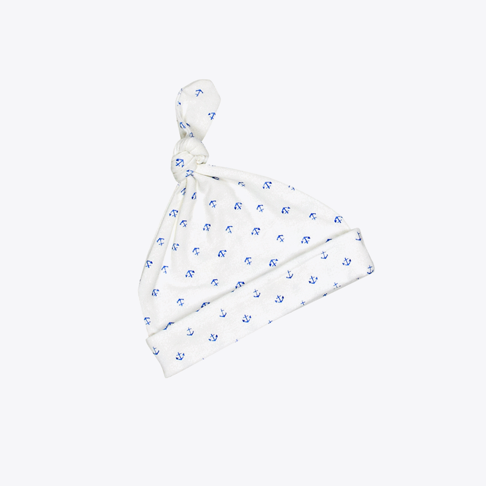Fun nautical light blue anchors on white knotted baby hat. Created in a soft jersey knit cotton with some stretch. Available in Anchor Gift Set! Style # B60035