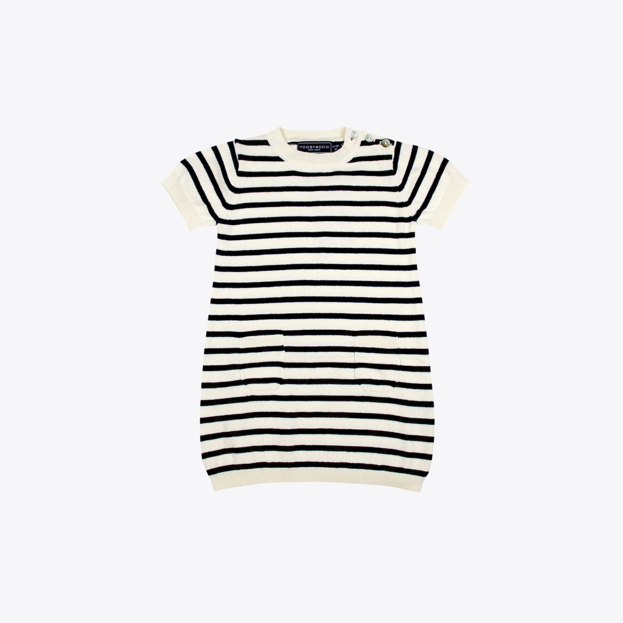 Classic Marine sweater dress for your little lady. Created in an ultra-soft cotton knit. Navy blue and natural white stripe pattern. Two small front pockets and real mother of pearl buttons on shoulder for easy dressing. Machine wash, hang dry. Style # B20130