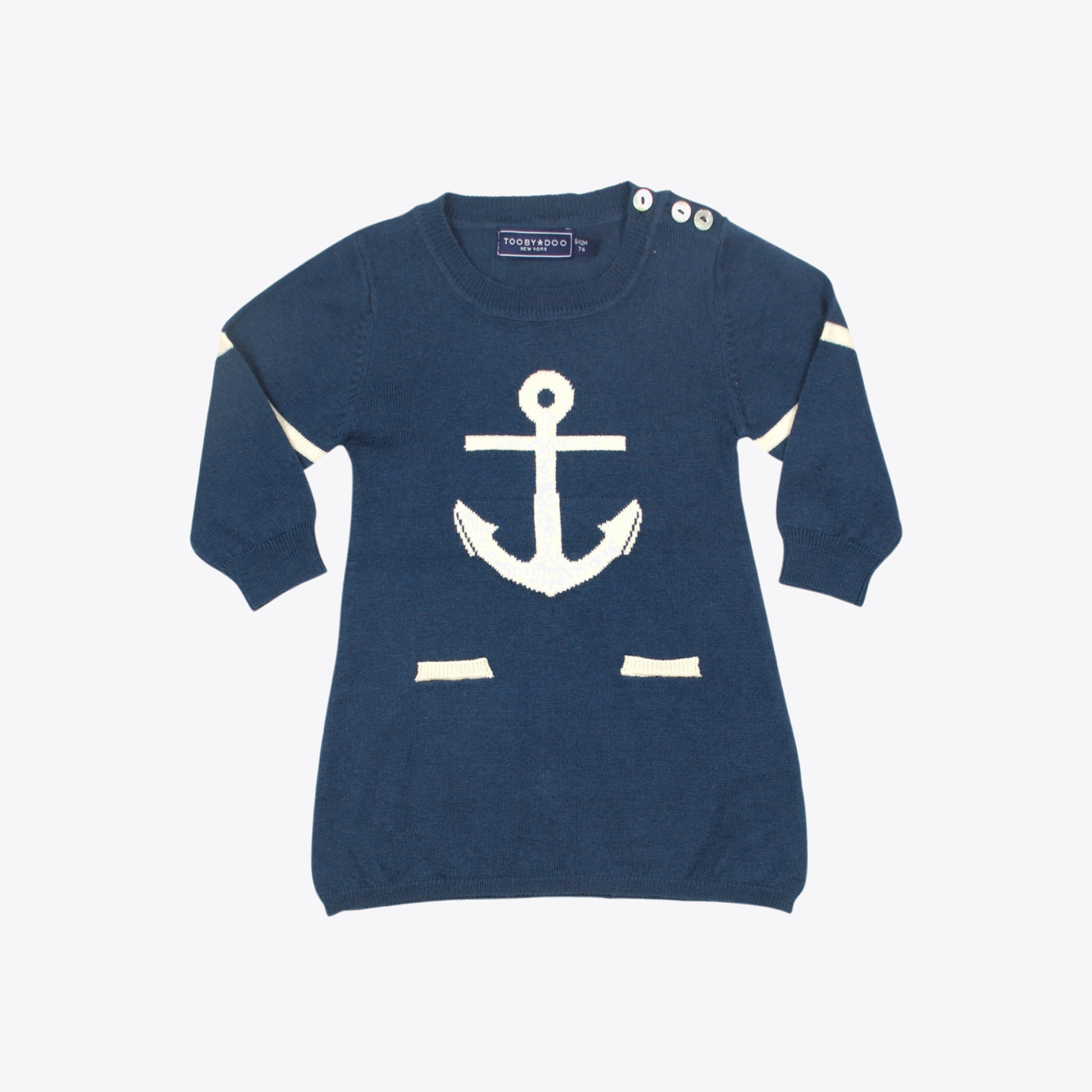 Signature Toobydoo sweater dress created in an ultra-soft, non-itching, cotton-cashmere (93/7) blend. Luxury custom yarn-dye colors. Mother of pearl shell buttons on shoulder for easy dressing. To complete the look, combine with one of our matching leggings. Machine washable. Style # B20074