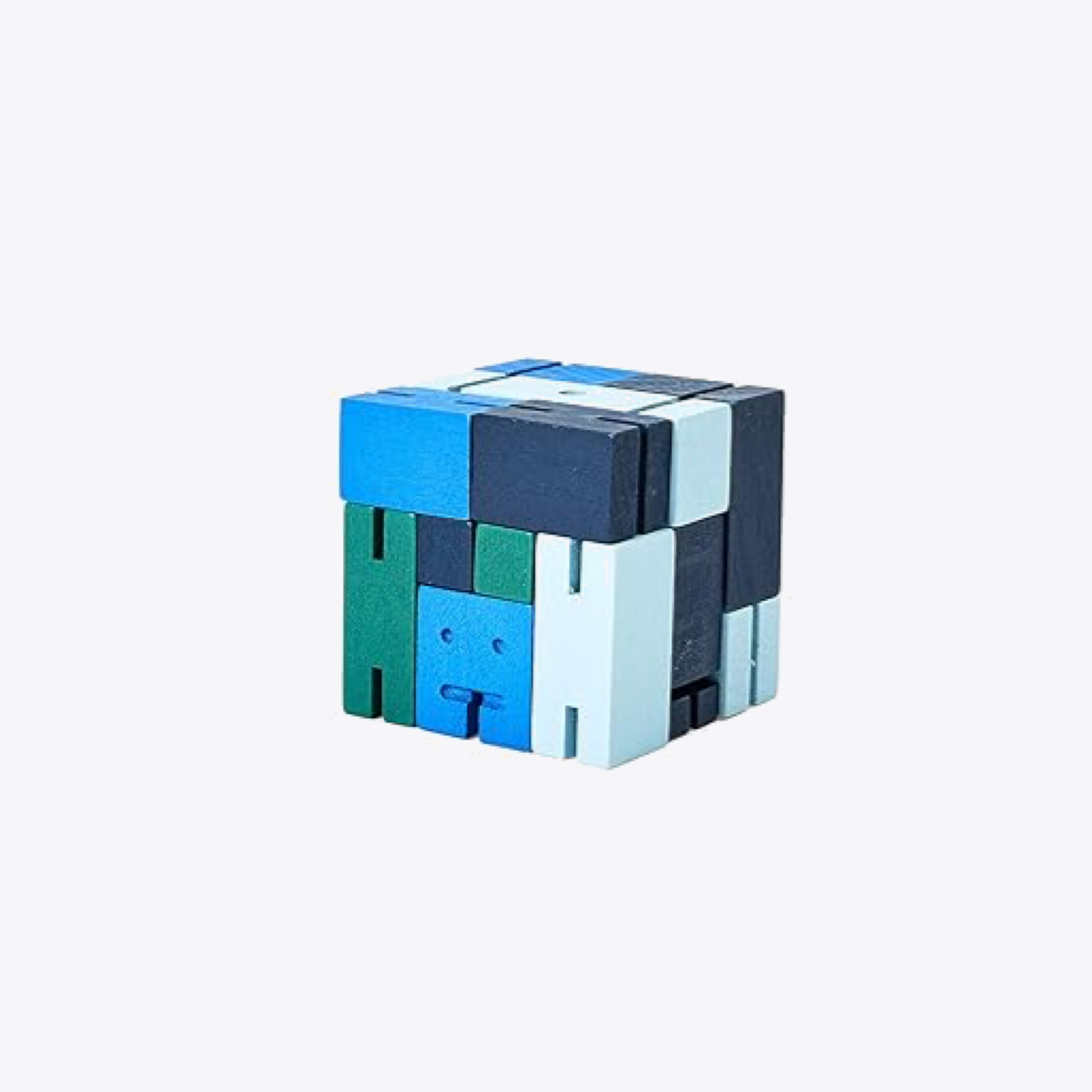 Cubebot® is a wooden toy robot inspired by Japanese Shinto Kumi-ki puzzles. Made from wood and elastic, Cubebot can be positioned to hold dozens of poses. When it's time to rest, Cubebot folds back into a perfect cube. A classic toy for all ages that will endure generations of play.