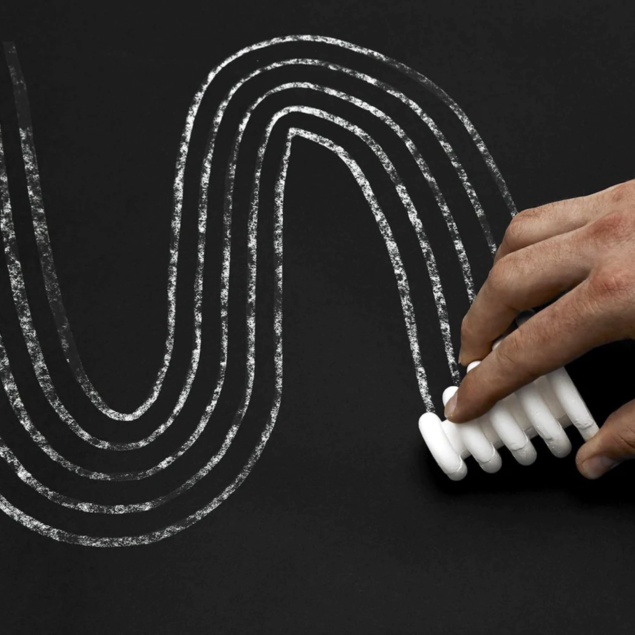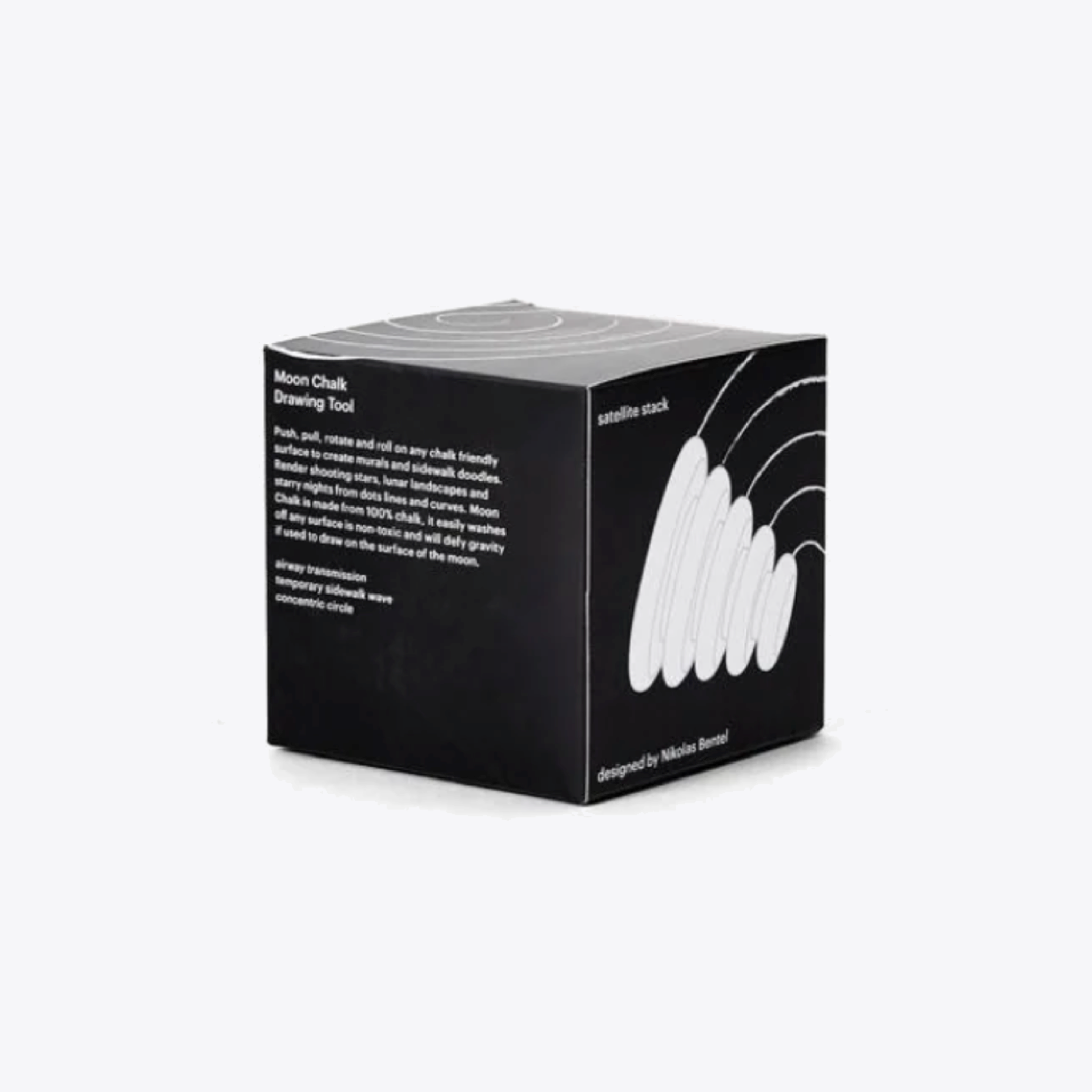 Designed by Nikolas Bentel for Areaware. Bentel has been commissioned by brands to create exciting, strange, and engaging experiences using alternate forms of product design, advertising and performance art. Bentel's goal in creating Moon Chalk was to make a geometrically precise drawing tool but something that creates new and original patterns that are not tied to exact measurements or drawing rules.