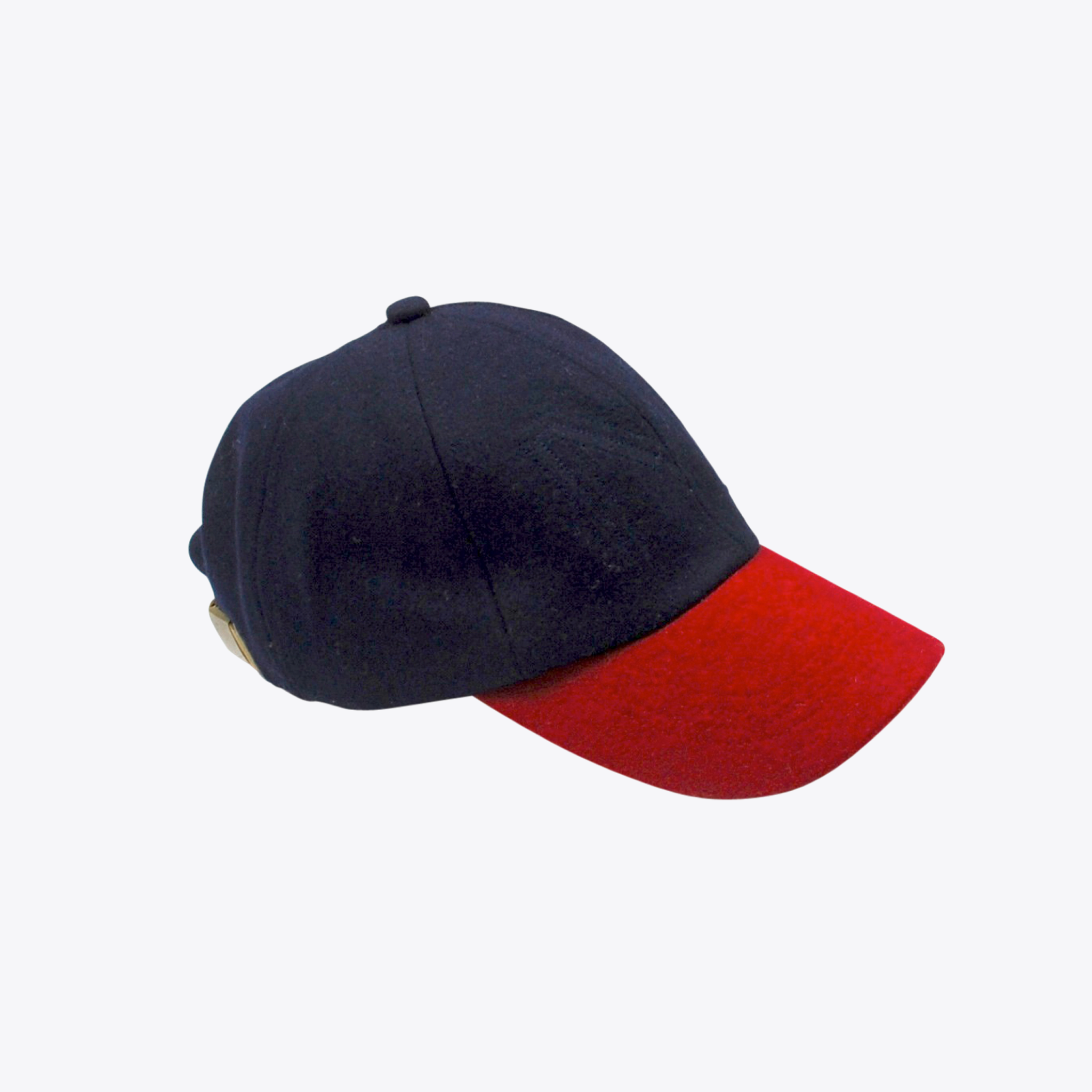 Classic wool color block baseball cap. In sophisticated navy and red. Real leather adjustable band on back. Soft padded cotton lining inside for comfortable wearing. Created from 65% wool and 35% viscose. Imported. Style # J60001