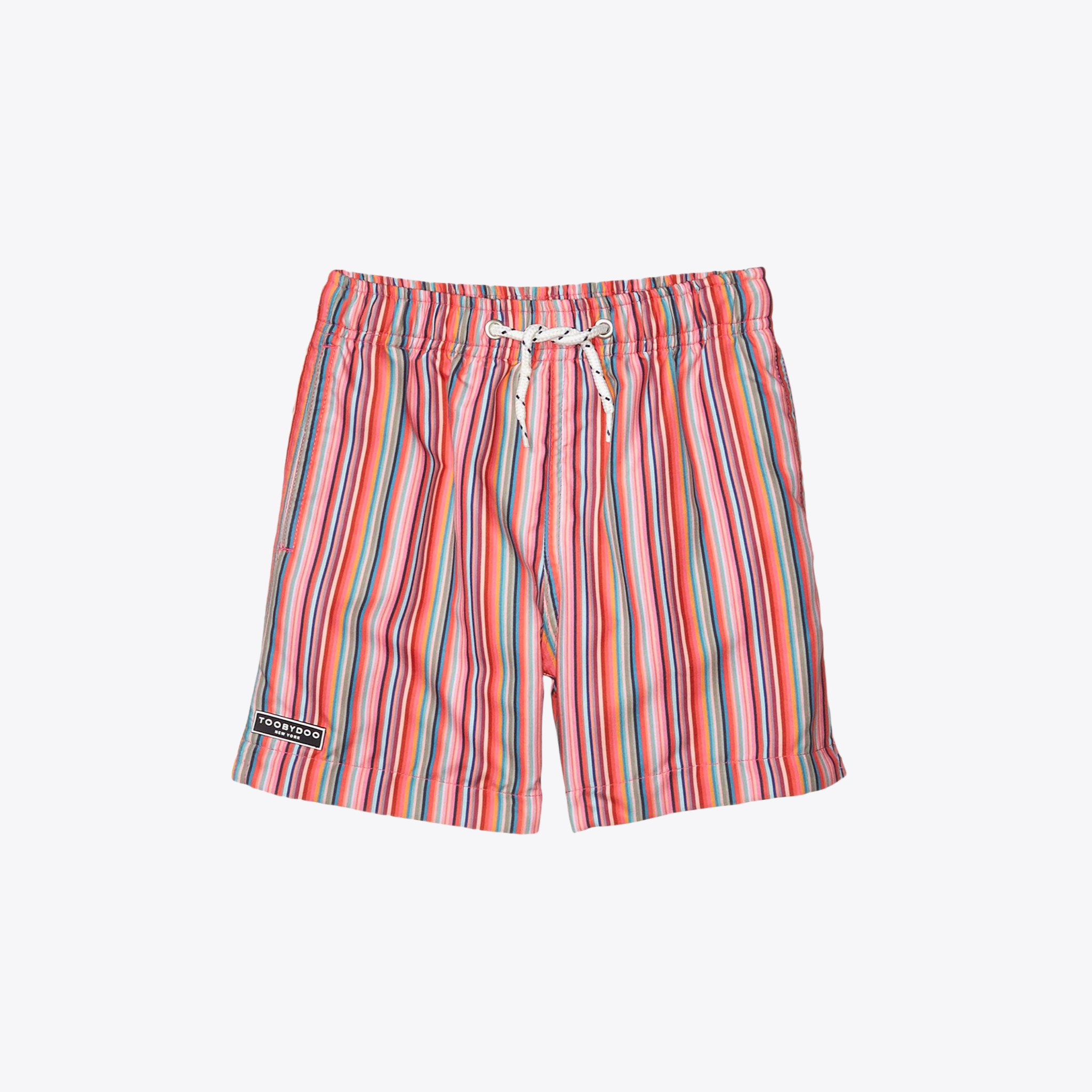 Luxury board shorts with signature Toobydoo vertical funk stripe print. Features an elastic waist band, sailor style drawstring, side pockets, full mesh lining, back pockets with velcro closure, special eyelets for rapid air evacuation. Shorts have a cotton feel and are quick drying (100% polyamide). Style # S20145