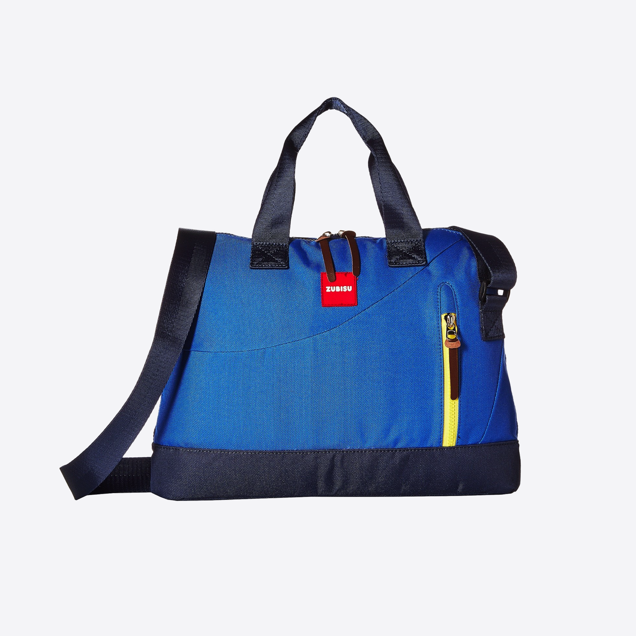 Introducing ZUBISU by Toobydoo. Blue laptop bag with contrasting navy straps. Roomy main compartment for your school and work essentials. Padded and lined 15 in laptop sleeve. Adjustable shoulder strap. Two interior slip pockets to help with organization. Laptop compartment: 12 in. Bottom Width: 15in. Middle width: 15in. Height: 11 in. Strap length: 53 in. 100% polyester shell and lining Style # Z3000