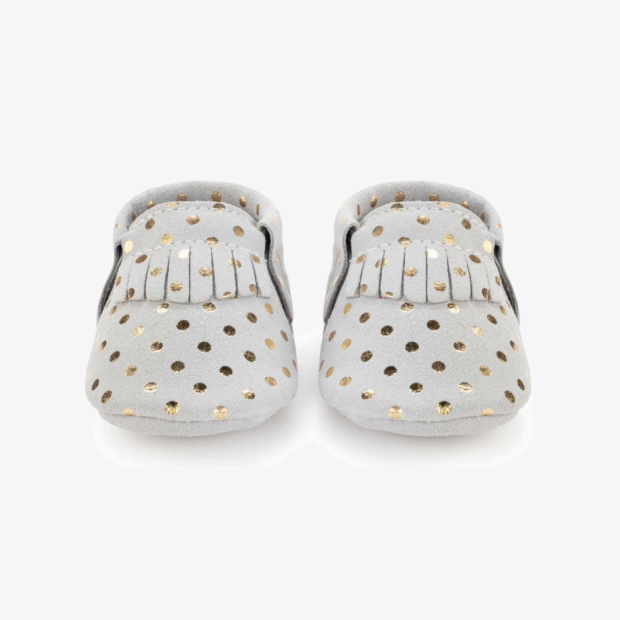 Our white with gold dots baby moccasins are always right for the princess in your life! Your babe will feel special wherever she goes in this classic beauty.