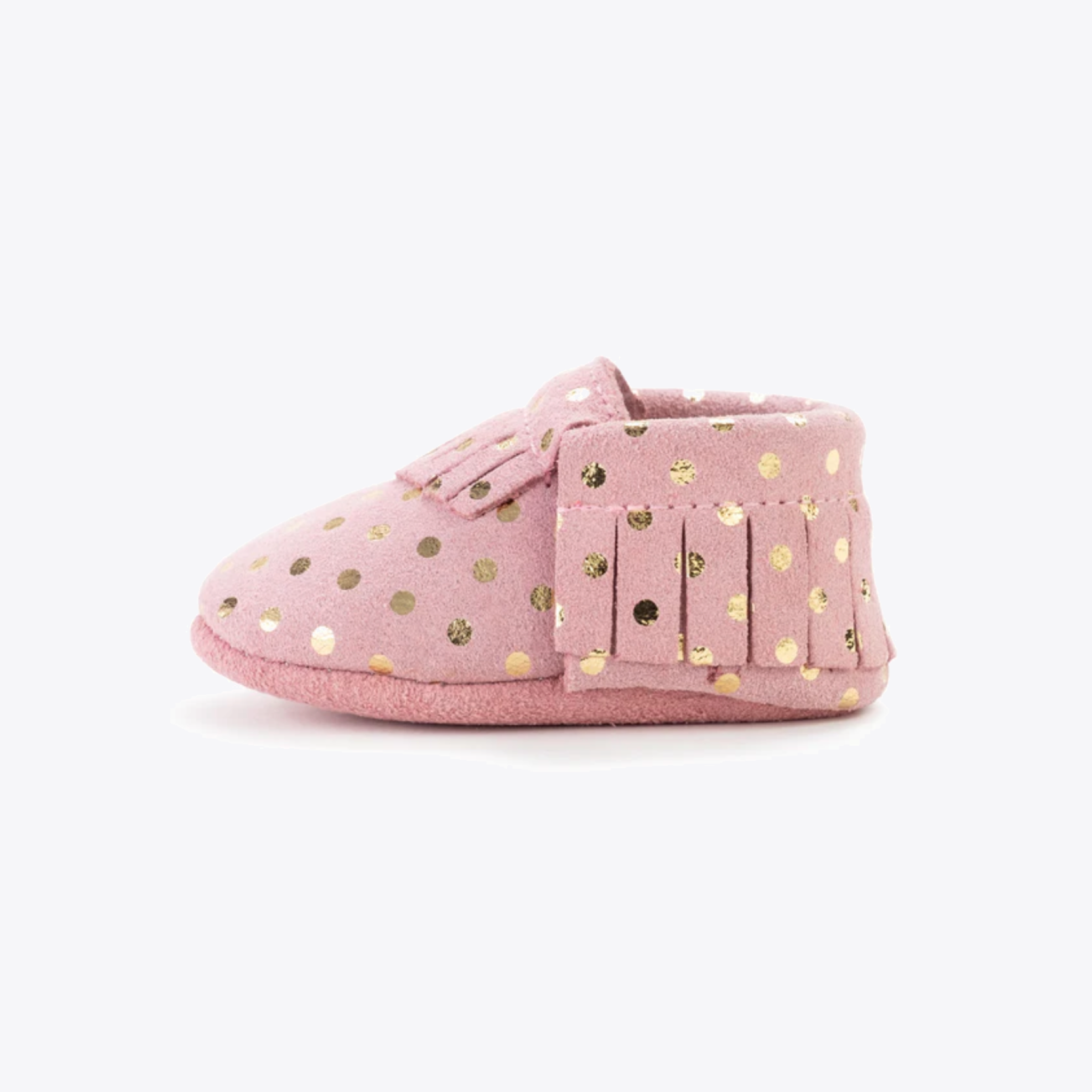 Our Confetti moccs are our most popular style ever, and it is no surprise why - these moccs are irresistibly cute! Confetti moccs feature pink with gold dots pattern. The elastic band at the ankle makes for easy on and off, and keeps them on through kicking, tugging, and first steps. Rich genuine leather shapes to your child's feet for a perfect fit and all-day comfort that is ideal for infants and toddlers alike.