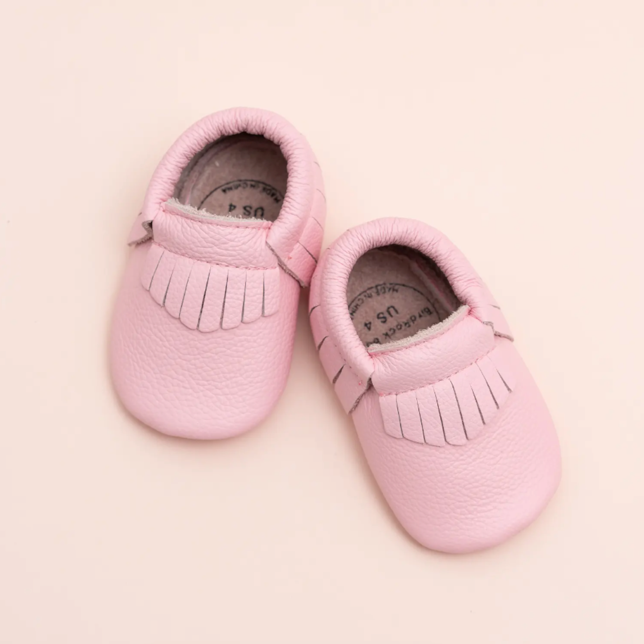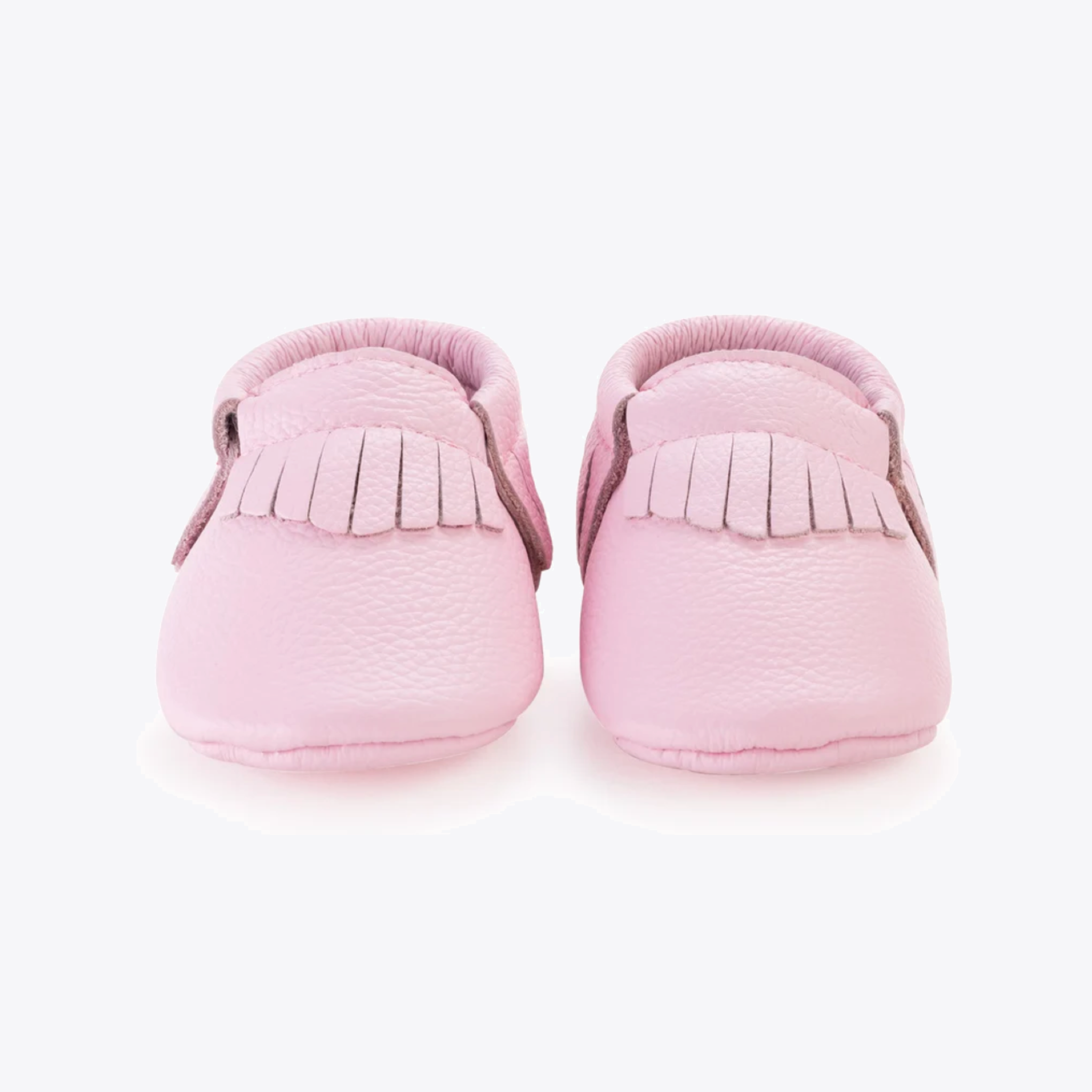 Our light pink baby moccasins are always right for the princess in your life! Your babe will feel special wherever she goes in this classic beauty.