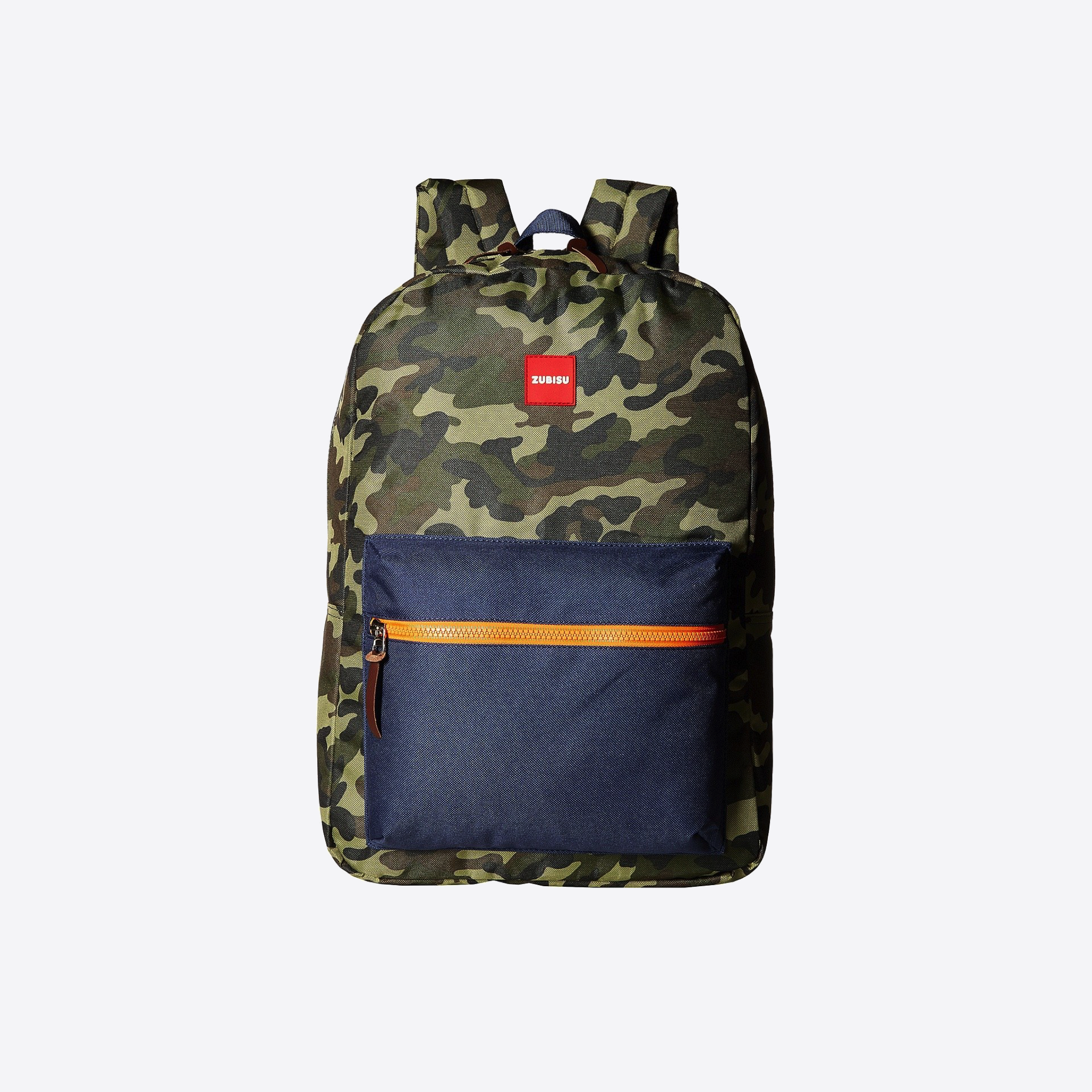 Introducing ZUBISU by Toobydoo. Large camo backpack with contrasting navy front pocket and orange zipper. Interior pocket can store a laptop or electronic device up to 15in. Classic silhouette with adjustable, padded shoulder straps. Measurements: Bottom width 13 in, depth 5 in, height 17 in. 100% polyester shell and lining Style # Z2004