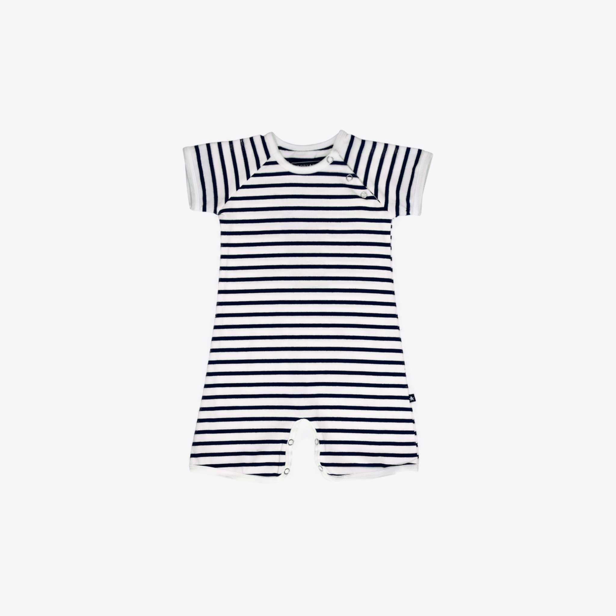 Short sleeve, short leg style jumpsuit with navy stripes on white. Created in an ultra-soft cotton-spandex blend. Snap buttons at front and around inside of legs for easy dressing. Machine washable. Style # B10316