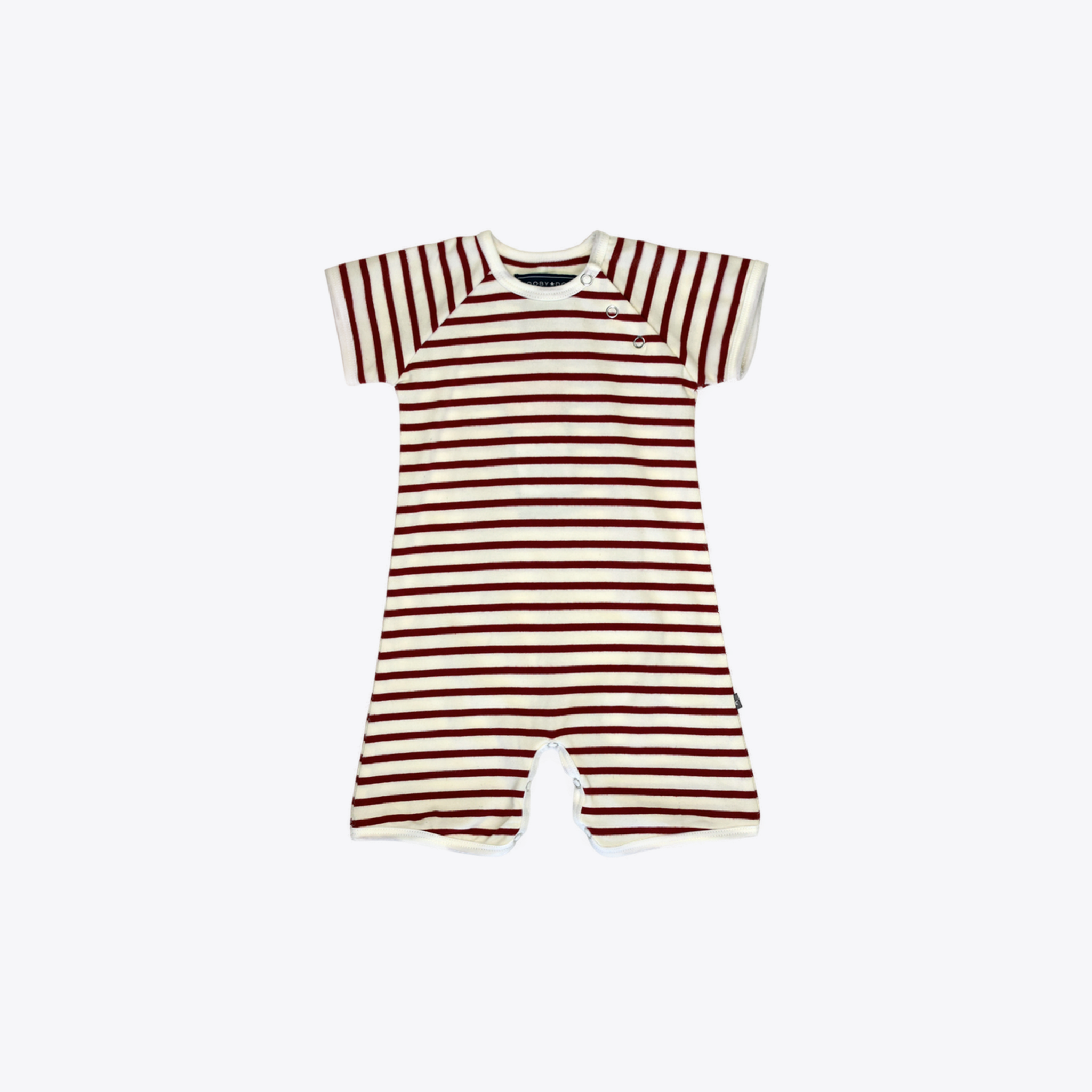 Short sleeve, short leg style jumpsuit with red stripes on white. Created in an ultra-soft cotton-spandex blend. Snap buttons at front and around inside of legs for easy dressing. Machine washable. Style # B10318