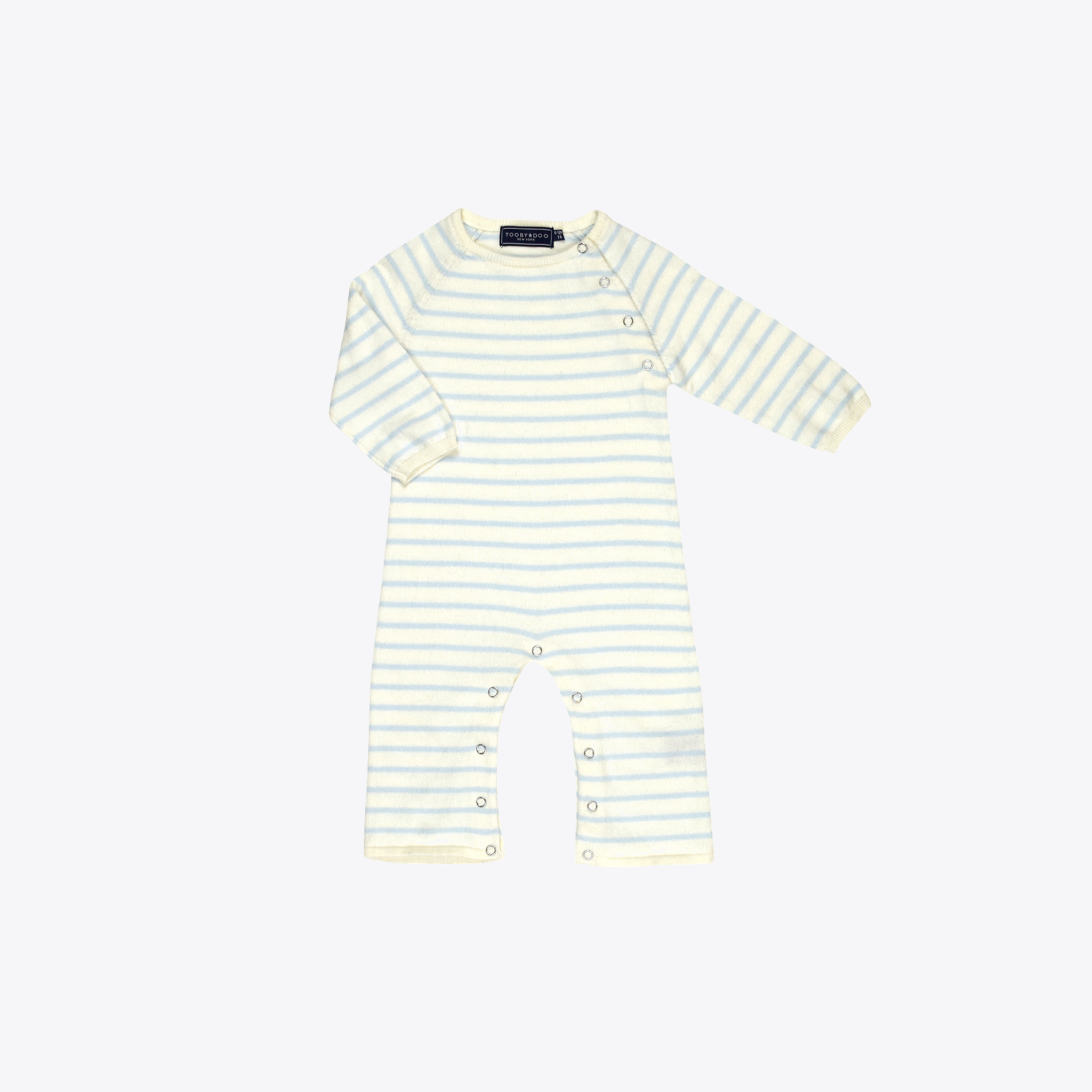 The perfect gift (ask for gift wrap and gift message at checkout). Signature boot cut style luxury super soft cotton -cashmere jumpsuit. Snap buttons at shoulder and inside legs for easy dressing. Soft light blue and natural white stripe. Machine washable. Style # B10420