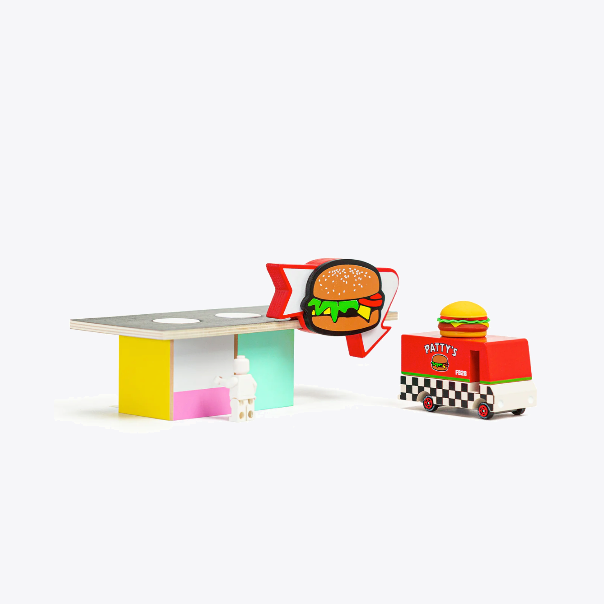 Scaled to work with our CANDYCAR® line. Combo includes one Patty's Hamburger Van. A step-by-step manual is also included to help with setup. No glue or tools are required. Assembly time is measured in seconds.
