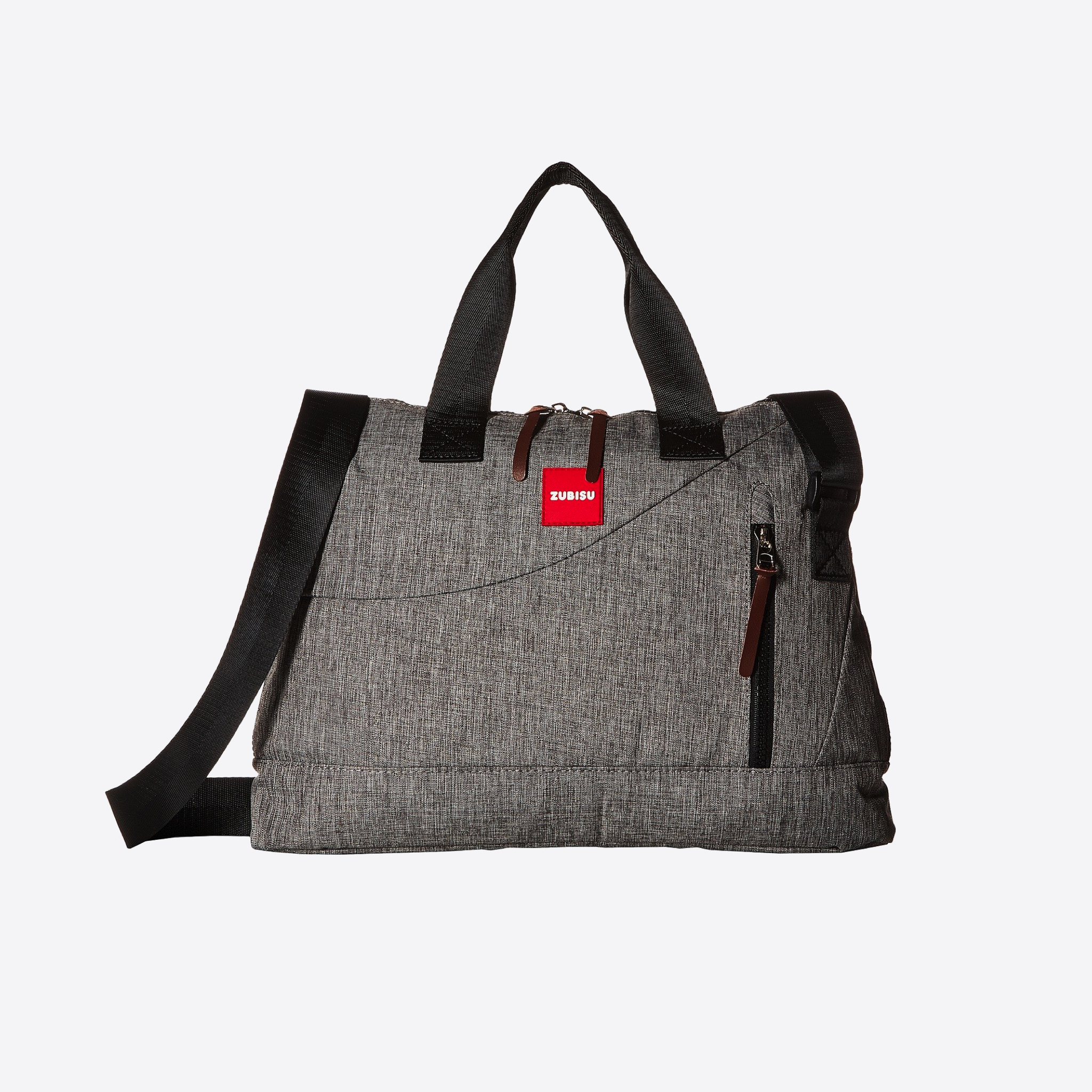 Introducing ZUBISU by Toobydoo. Grey laptop bag with contrasting black straps. Roomy main compartment for your school and work essentials. Padded and lined 15 in laptop sleeve. Adjustable shoulder strap. Two interior slip pockets to help with organization. Laptop compartment: 12 in. Bottom Width: 15in. Middle width: 15in. Height: 11 in. Strap length: 53 in. 100% polyester shell and lining Style # Z3003