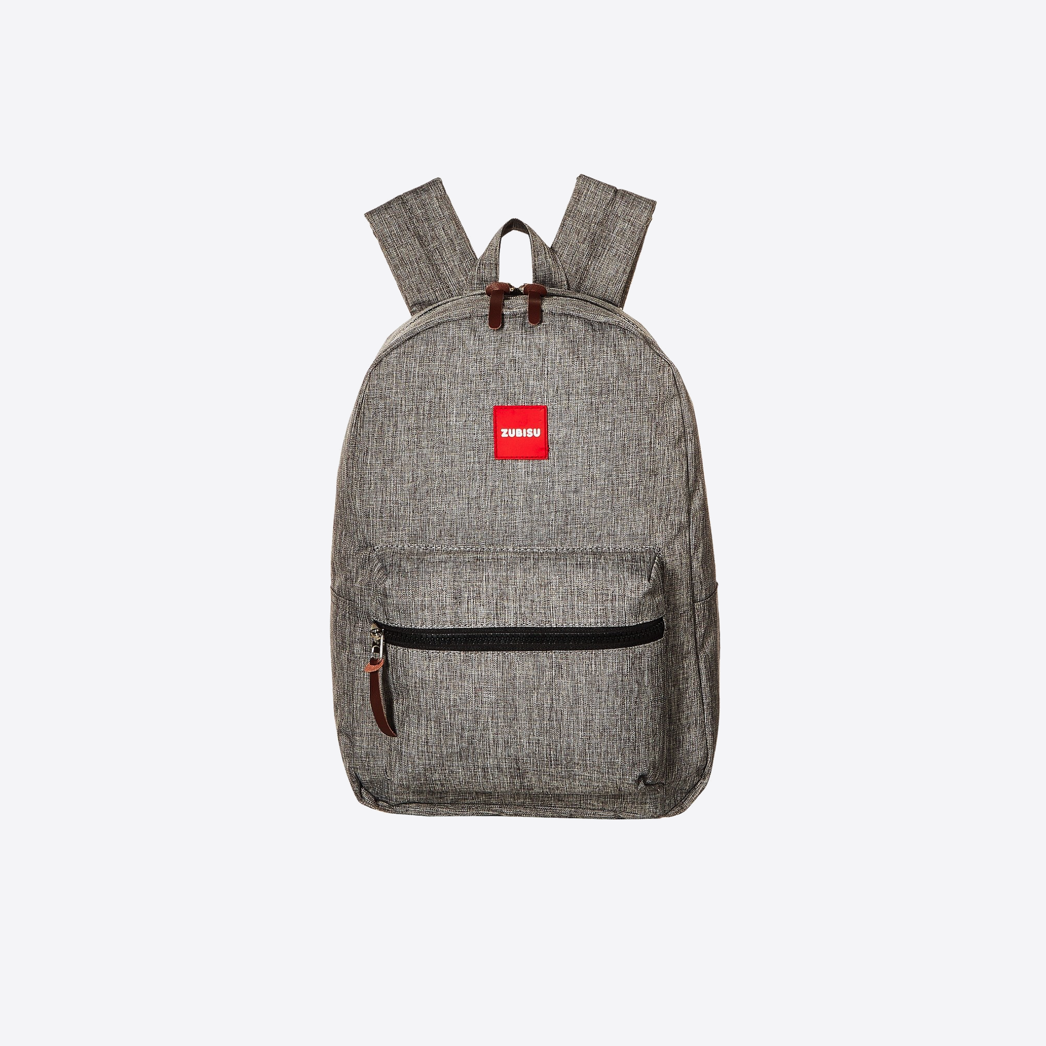 Introducing ZUBISU by Toobydoo. Small grey backpack with black zipper. Interior pocket can store small laptop or electronic device. Classic silhouette with adjustable, padded shoulder straps. Botton width 9 in, depth 4 in, height 14 in. 100% polyester shell and lining Style # Z1003