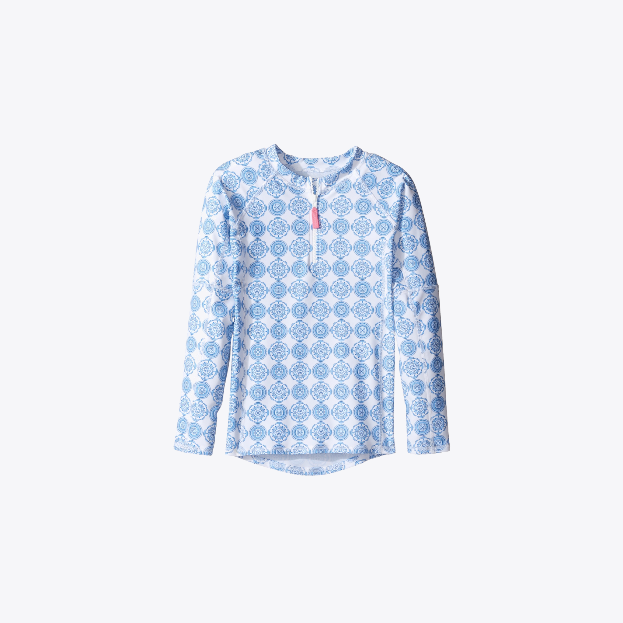 Long sleeve rash guard top with UPF broad spectrum sun protection. Quick drying, lightweight and breathable. High collars for added delicate neck sun protection. Delft Blue pattern all around with contrast pick zipper. Small rubber, sophisticated Toobydoo logo on back. Imported Style # S50039