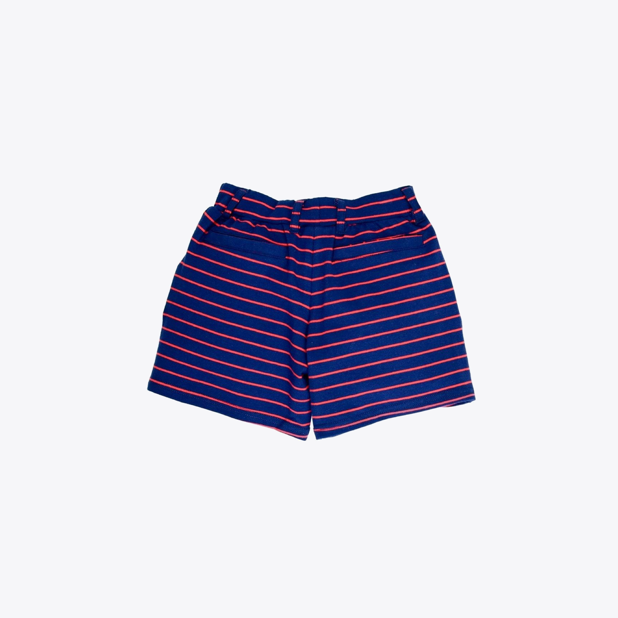 Designed for the hippest girl in town! The perfect mix & match item that goes with anything. Large front pockets. Dark navy with thin red stripes. Wide elastic waist band and drawstring for a comfortable fit. Faux back pockets and zipper flap.Created in a soft French terry cotton. Machine washable. Style # M40096