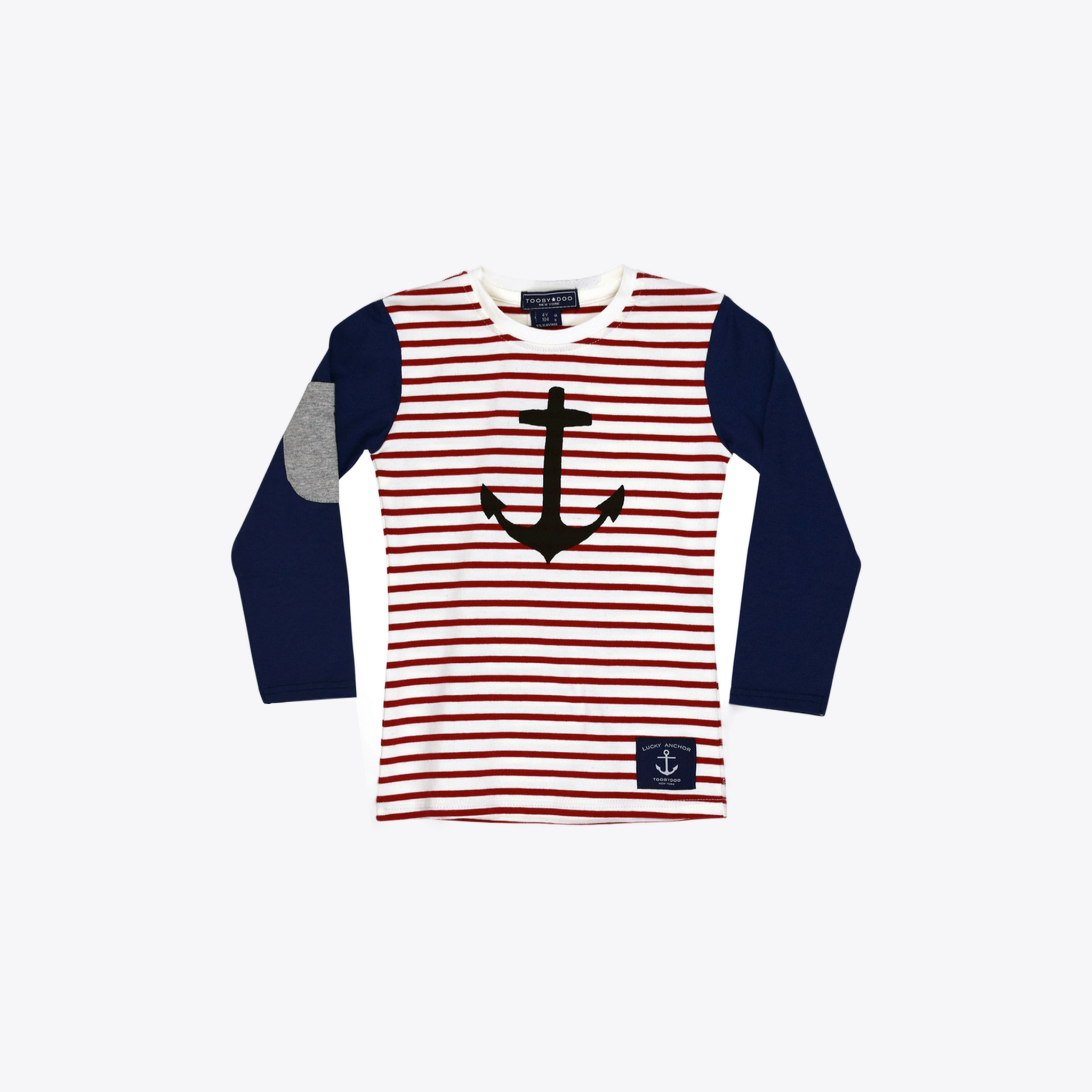 Soft natural white and red stripe with navy blue long sleeve T-shirt with anchor print. Small pocket on arm. Created in a soft cotton with a touch of stretch. Machine washable. Style # M30093