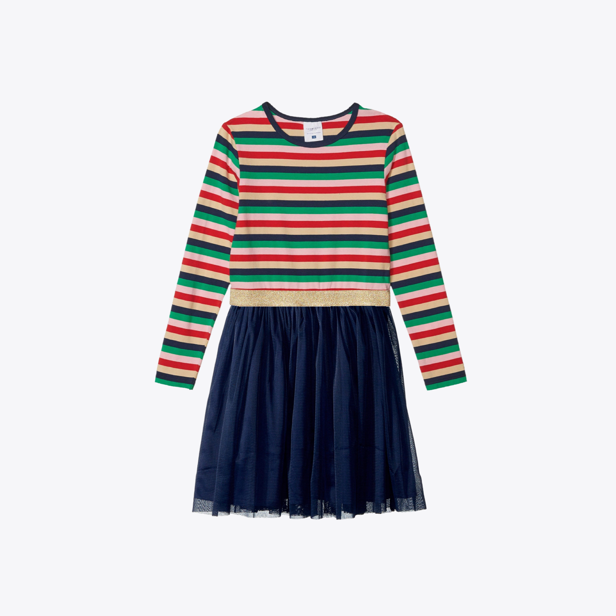 Every little girl's favorite dress! The perfect combination of a super twirl party skirt and comfortable soft fabric. Jersey knit top with multi-color stripe, navy tulle skirt and sparkly gold elastic waist band. Navy colored lined woven skirt. Machine wash and hang dry. Style # M20718