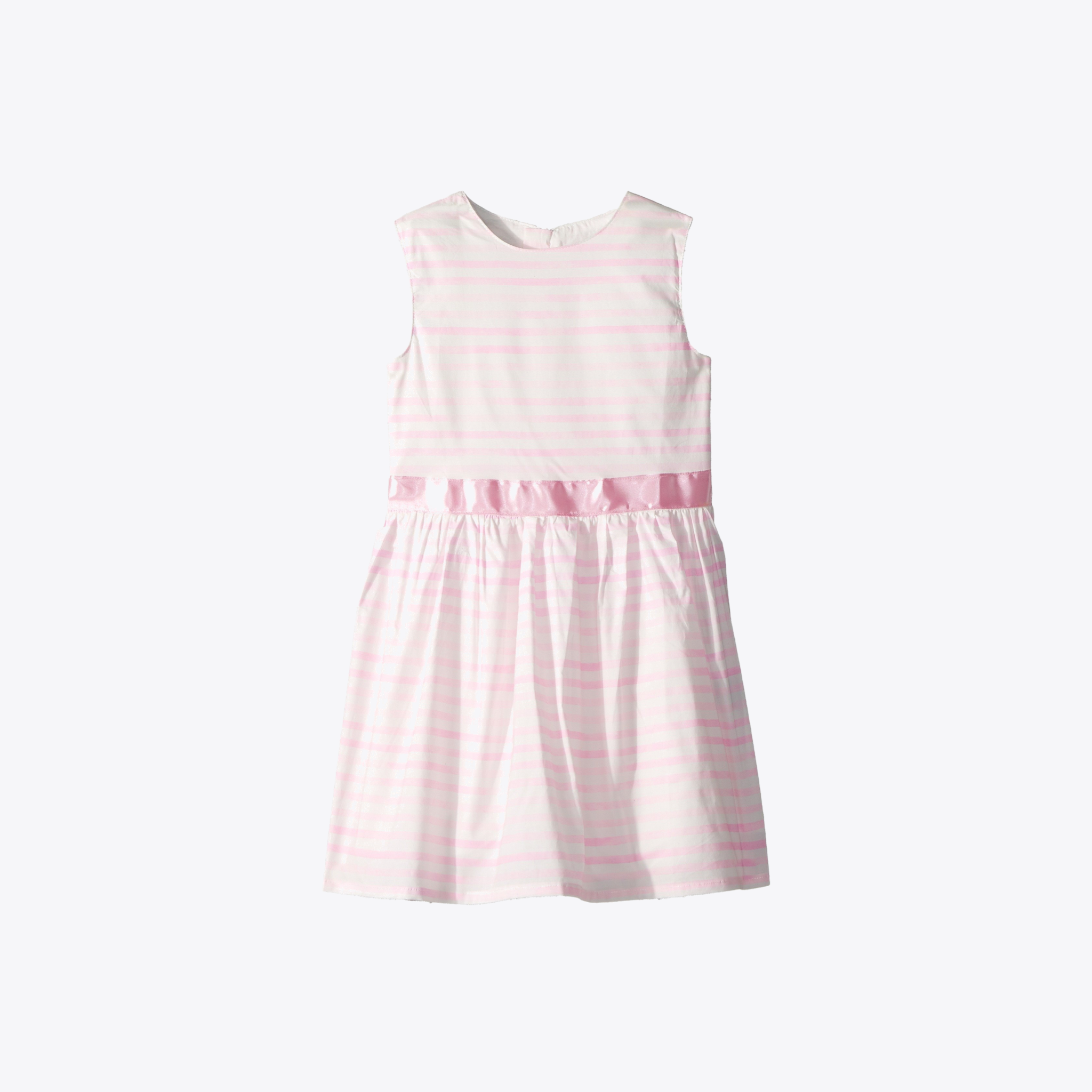 In style to go to the garden party. Sleeveless party dress with a pink and white stripe with faux pink satin belt. Zipper closure on back. Created in 100% woven cotton. Thin white cotton lining inside dress. Machine washable. Style # M20486