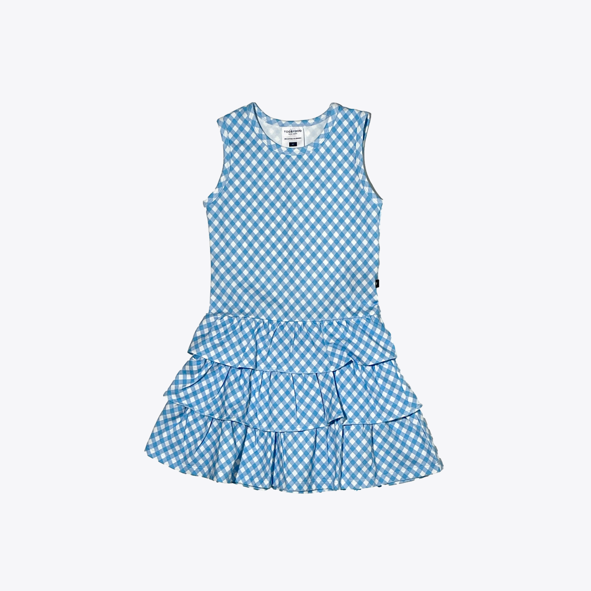 Toobydoo fan favorite! Versatile ruffled tank dress that is both stylish and easy to wear and play in. Playful and bright light blue check. Created in a soft stretch cotton. Machine washable. Style # M20729