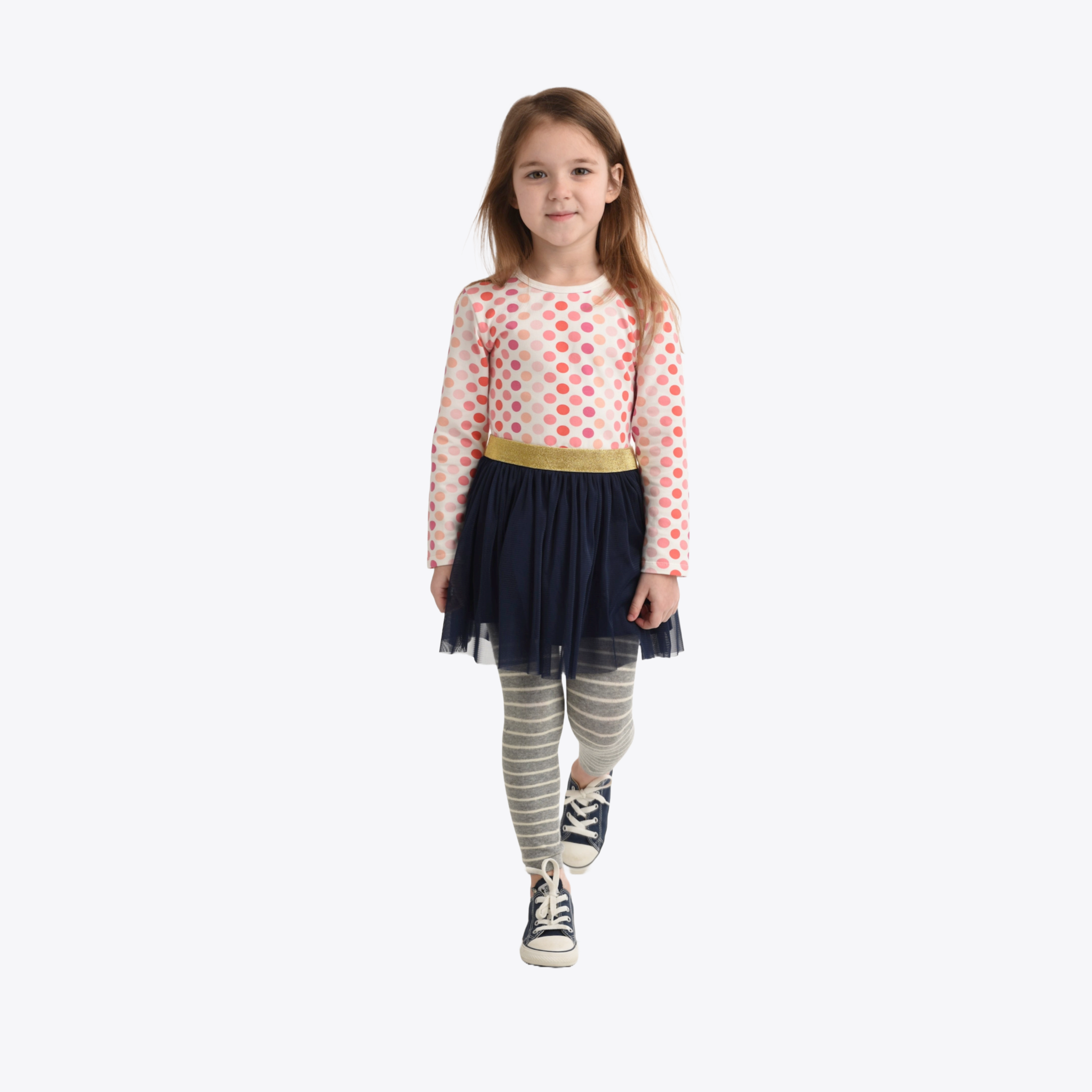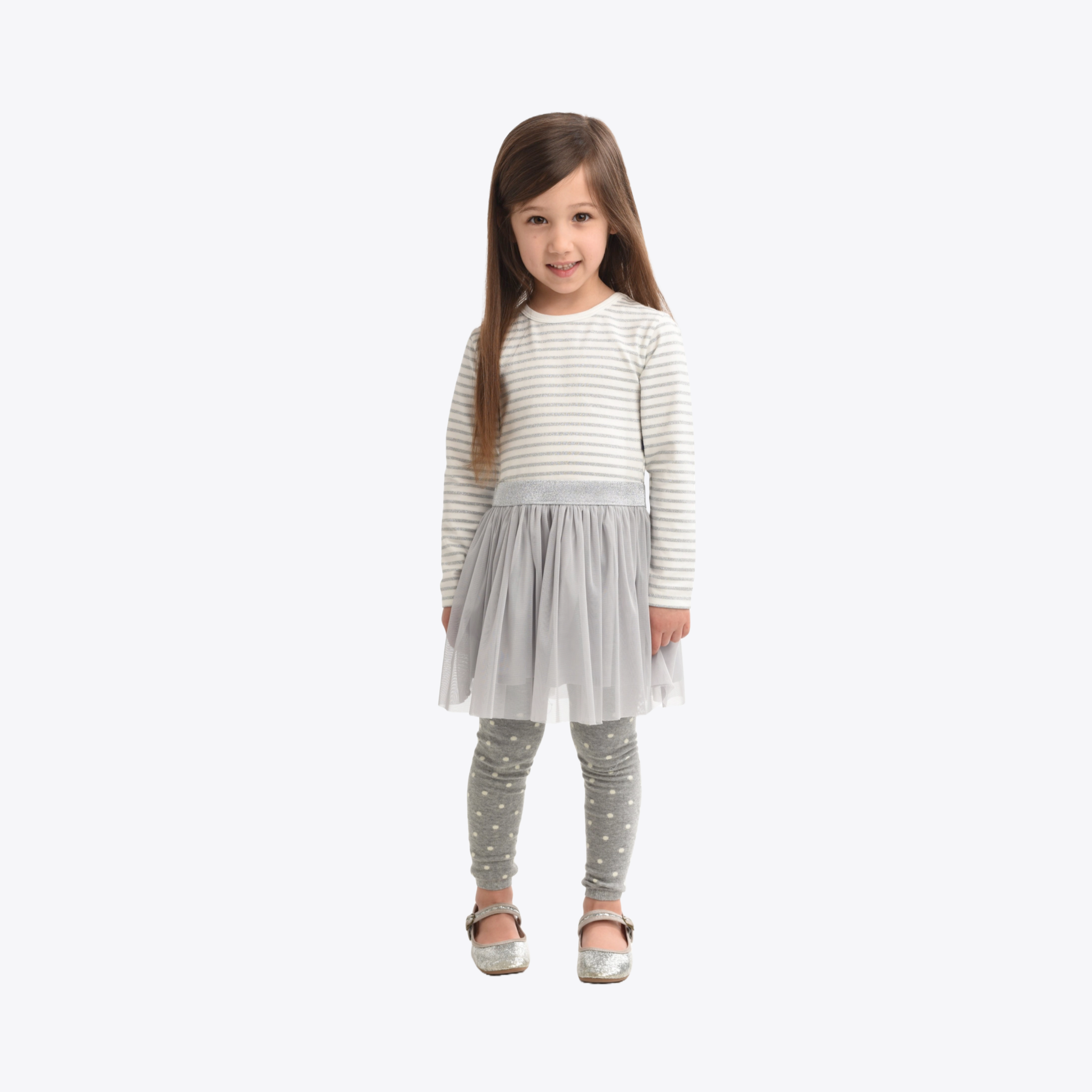 In the mood for stripes or dots?åÊTwo-pack of footless leggingsåÊin a heather grey and natural white stripe pattern and dots pattern. Perfectly matches Toobydoo dresses. Wide elastic waist band for more comfort. Created in a comfortable and soft 70% cotton, 27% polyester and 3% spandex blend. Machine washable. Imported. Style # A50027