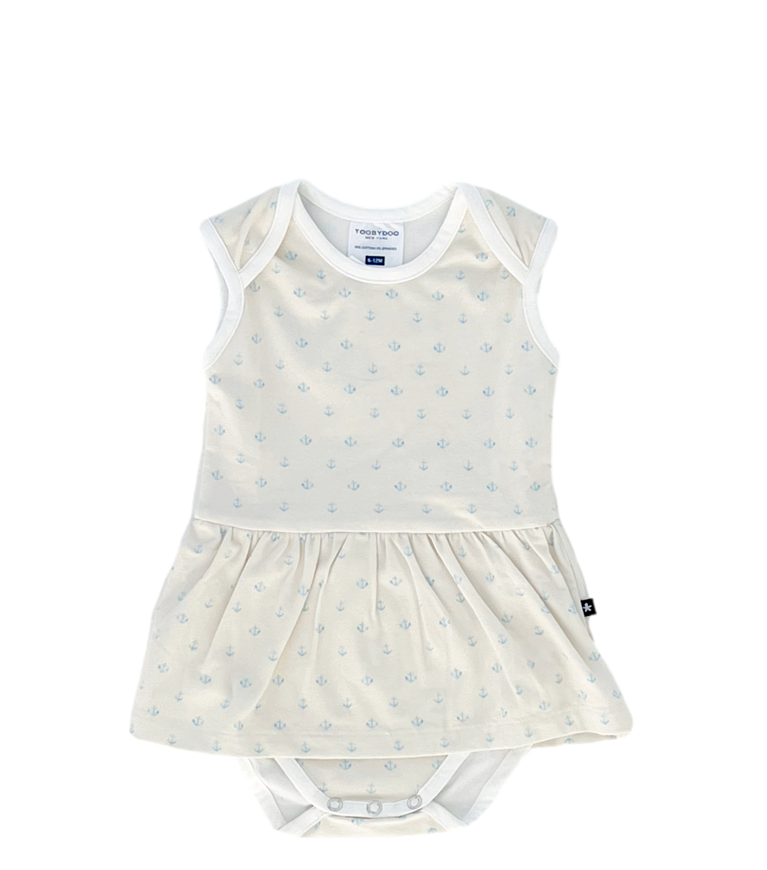 Cute baby sun dress in a fun anchor print. Envelope style neck opening with snap buttons at legs for easy dressing. Created in a super soft luxury stretch cotton blend. Machine washable. Style # B10670