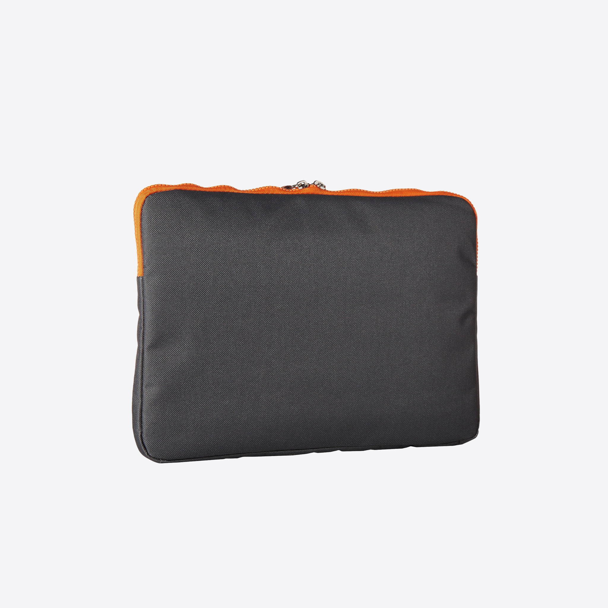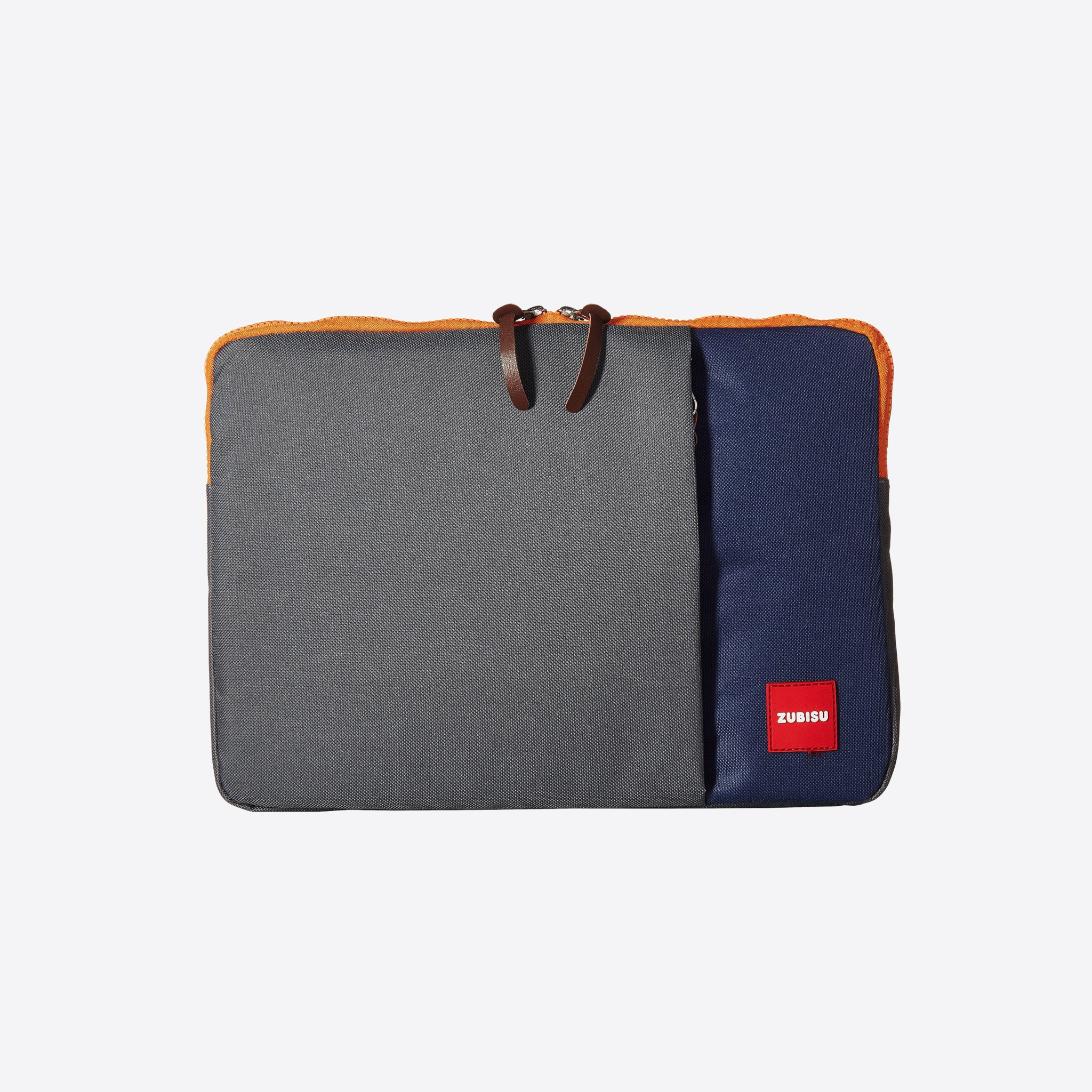 Introducing ZUBISU by Toobydoo. Laptop sleeve with 2 way zipper closer. Two-panel sleeve design for 15 in laptop. Fully padded and lined interior with padded front pocket for added storage. Dark grey and dark navy color block with fun pop of orange on the zipper and brown faux leather pulls.