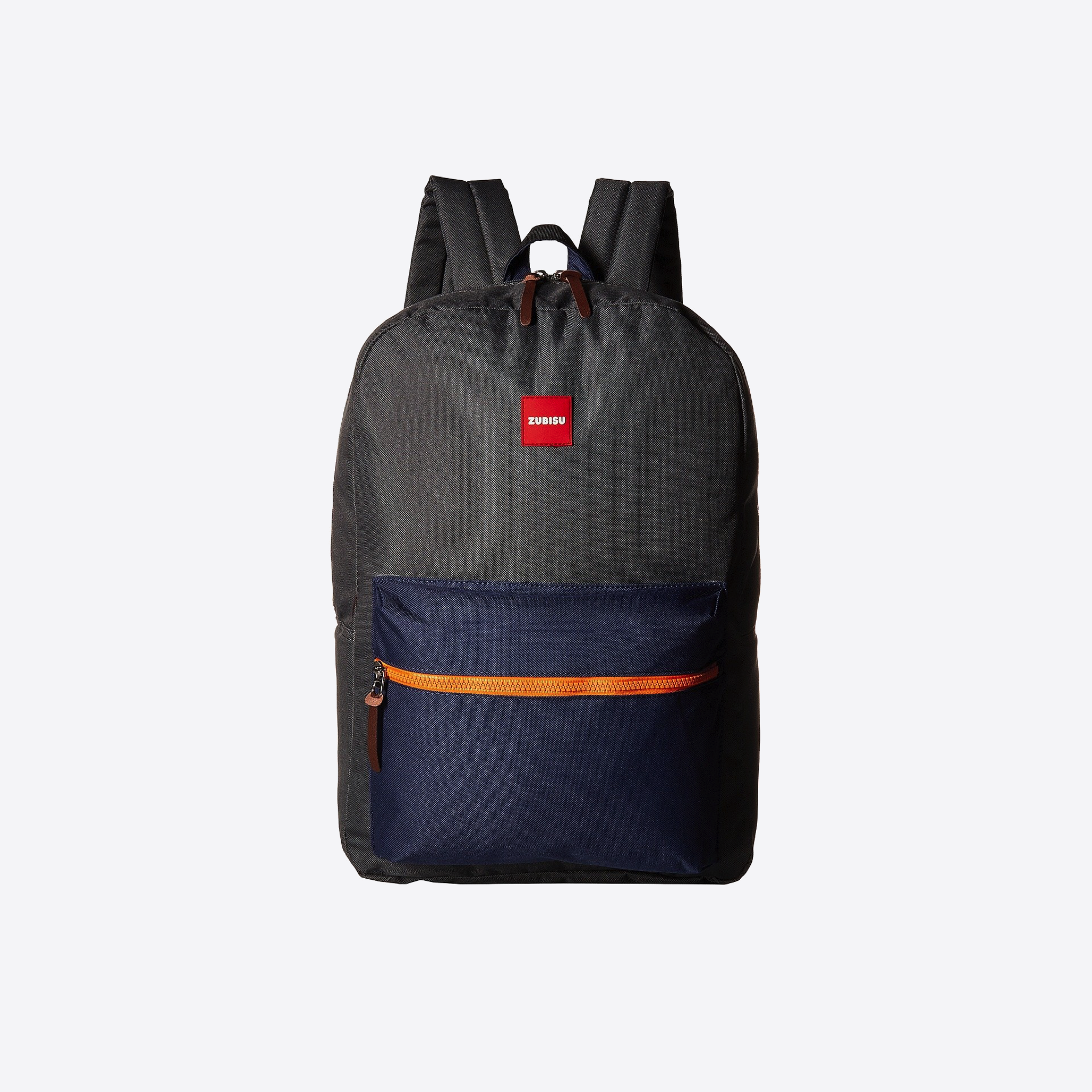 Introducing ZUBISU by Toobydoo. Large Grey backpack with contrasting navy front pocket and orange zipper. Interior pocket can store a laptop or electronic device up to 15in. Classic silhouette with adjustable, padded shoulder straps. Bottom width 12 in, depth 5 in, height 18 in. 100% polyester shell and lining Style # Z2002