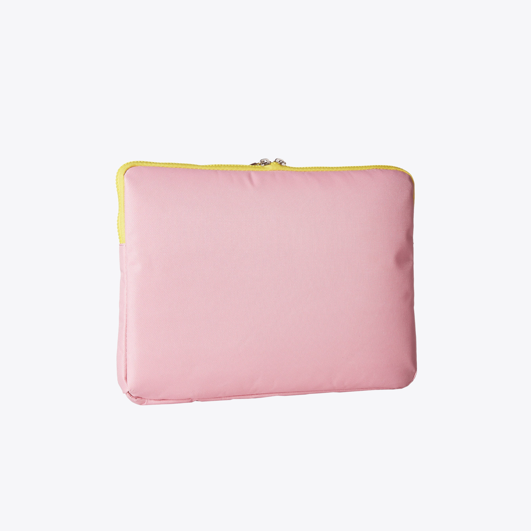Introducing ZUBISU by Toobydoo. Pink and blue laptop sleeve with yellow 2 way zipper closer. Two-panel sleeve design for 15 in laptop. Fully padded and lined interior with padded front pocket for added storage.