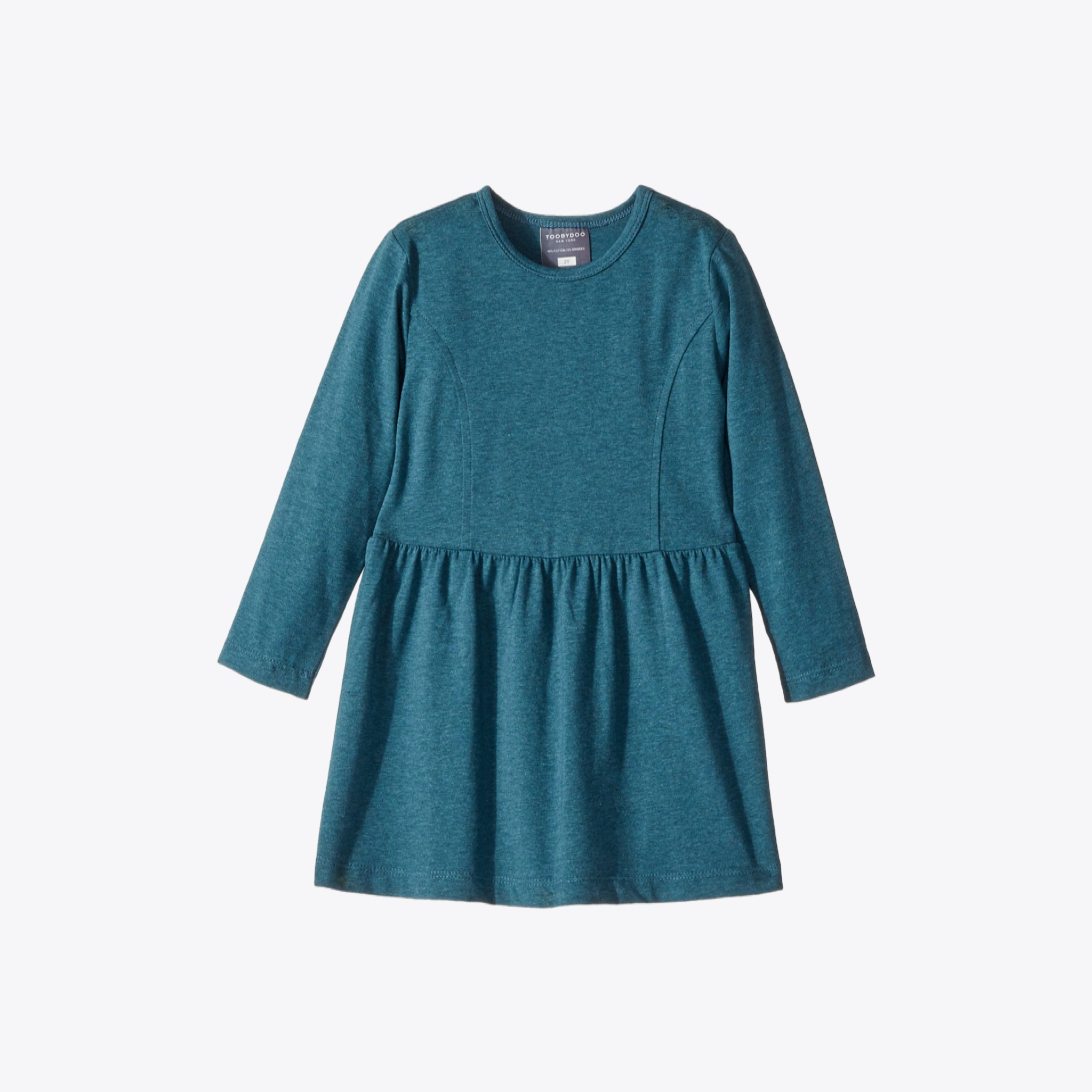 The essential dress for the girl on the go. Versatile skater style dress in a super soft cotton with a touch of stretch. Heather teal color, long sleeve, pleated skirt. Machine washable. Style # M20427