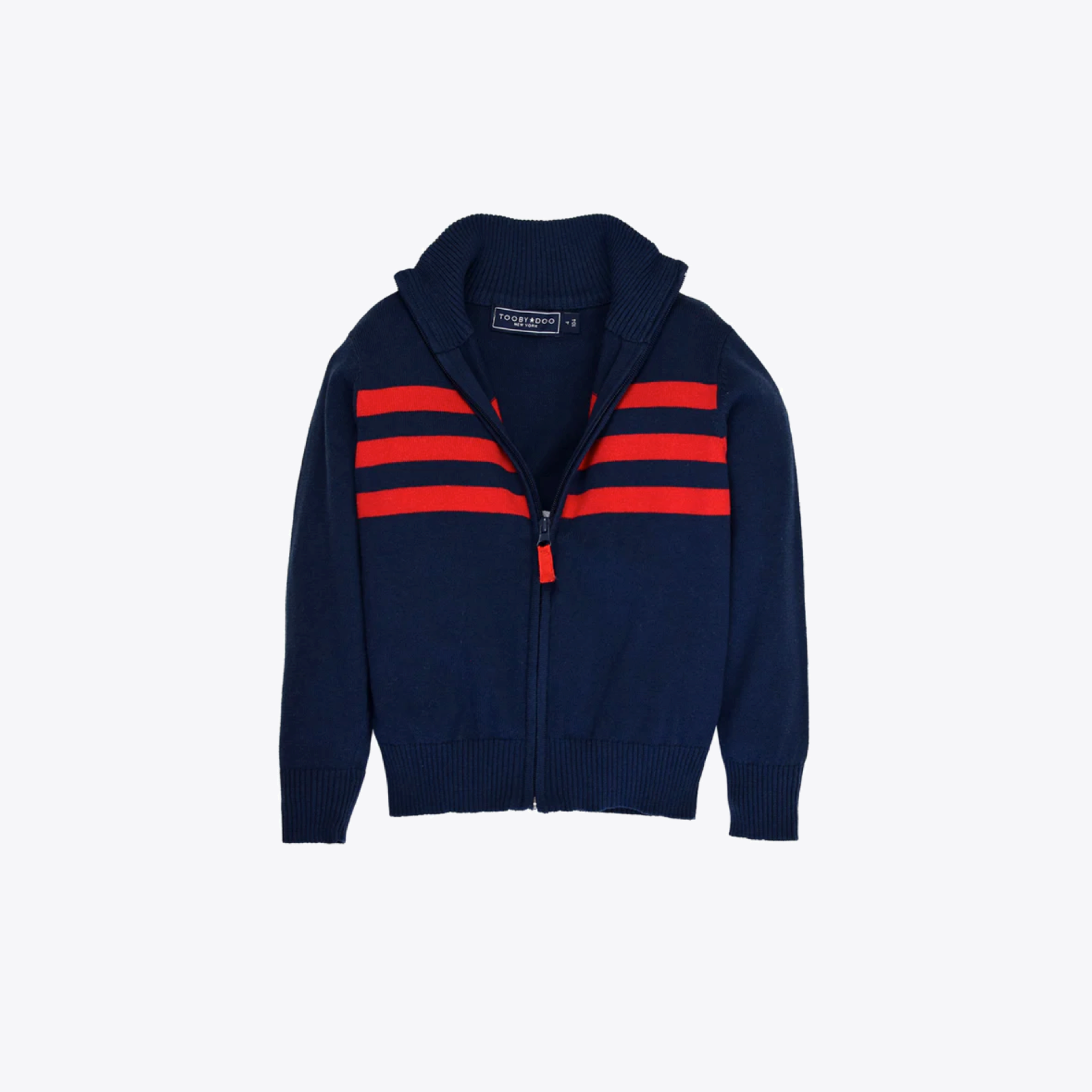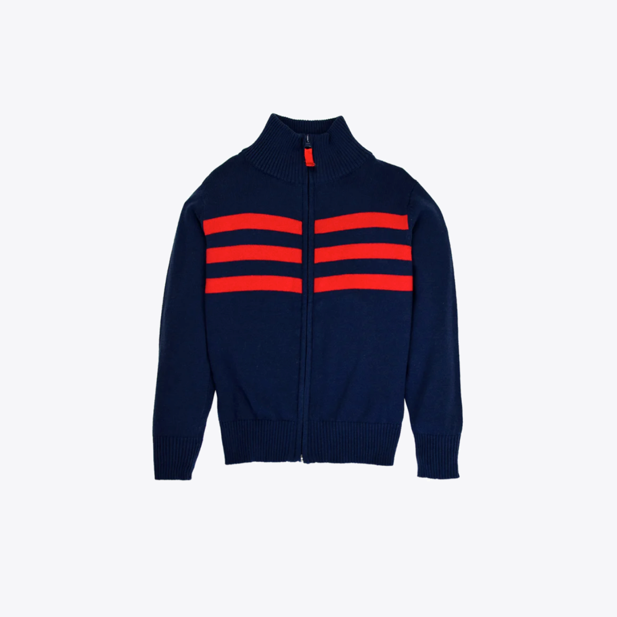 Great for a day after the beach or layering over a cool t-shirt. Soft cotton navy knit zip sweater with red stripes across the chest. Matching zipper with red pull tab. Ribbed cuffs, collar and waist band complete this super cool look. Machine washable. Style #J50155ZS