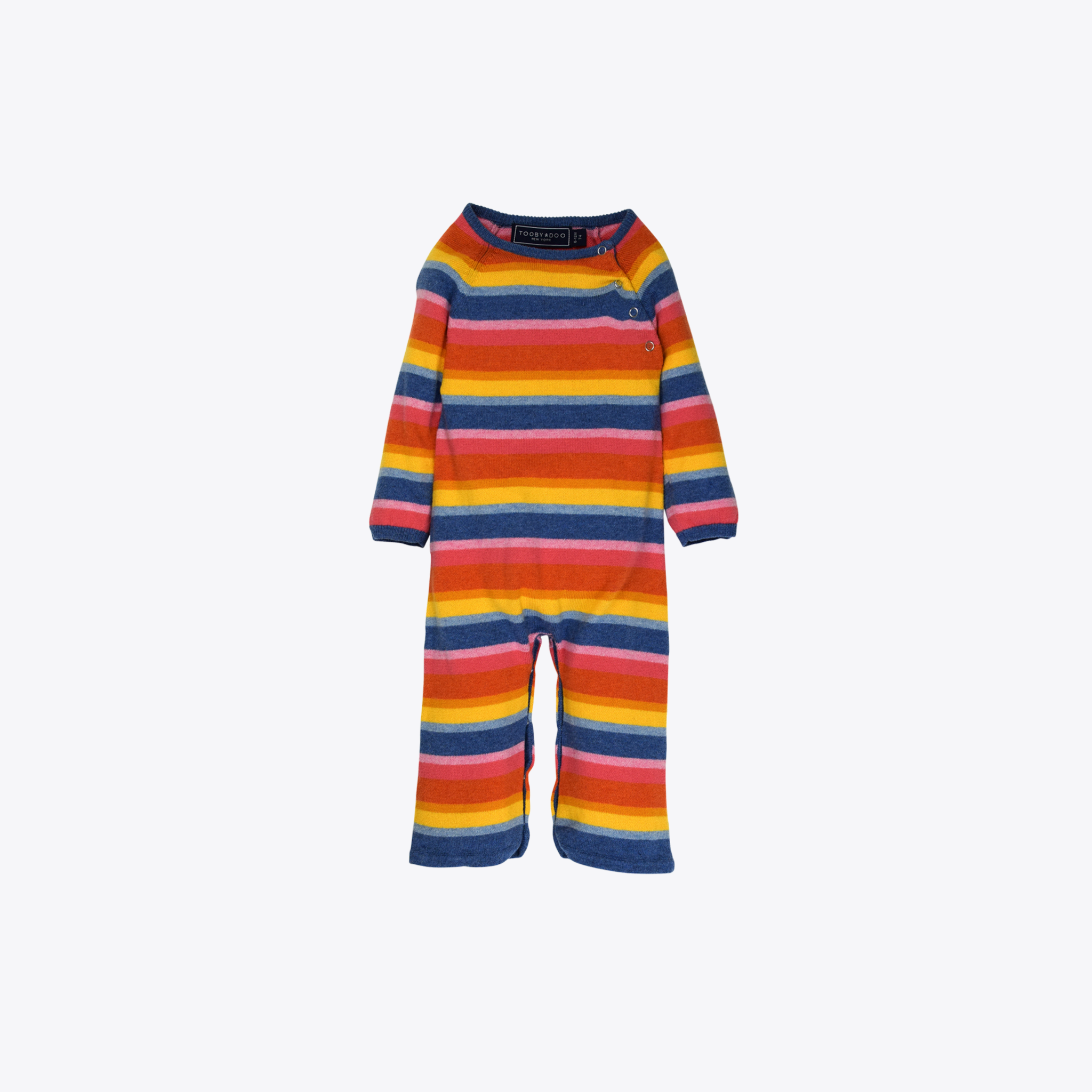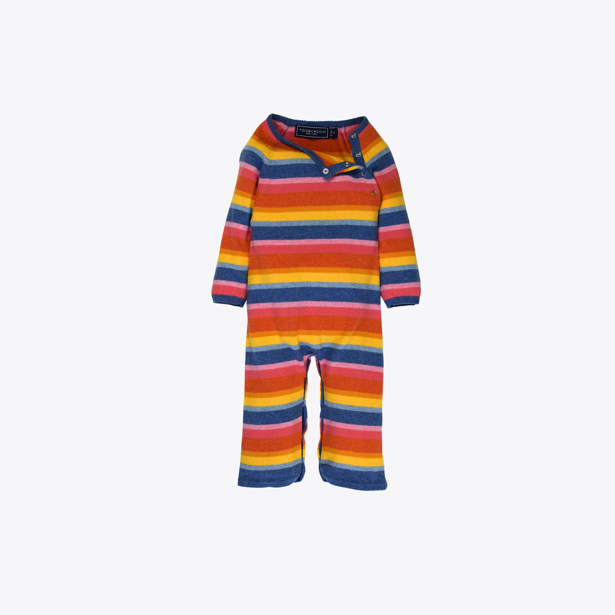 Signature boot cut style jumpsuit with industrial style metal snap buttons on chest and inside legs for easy dressing. Stunning rainbow stripes in blues, pinks, oranges and yellows makes this the perfect unisex gift. Need a gift? Pair it with the matching blanket, pink hat or blue hat. Created in an ultra-soft cashmere blend for a comfortable fit (95% cotton, 5% cashmere). Luxury knit. Machine washable. Style # B10614