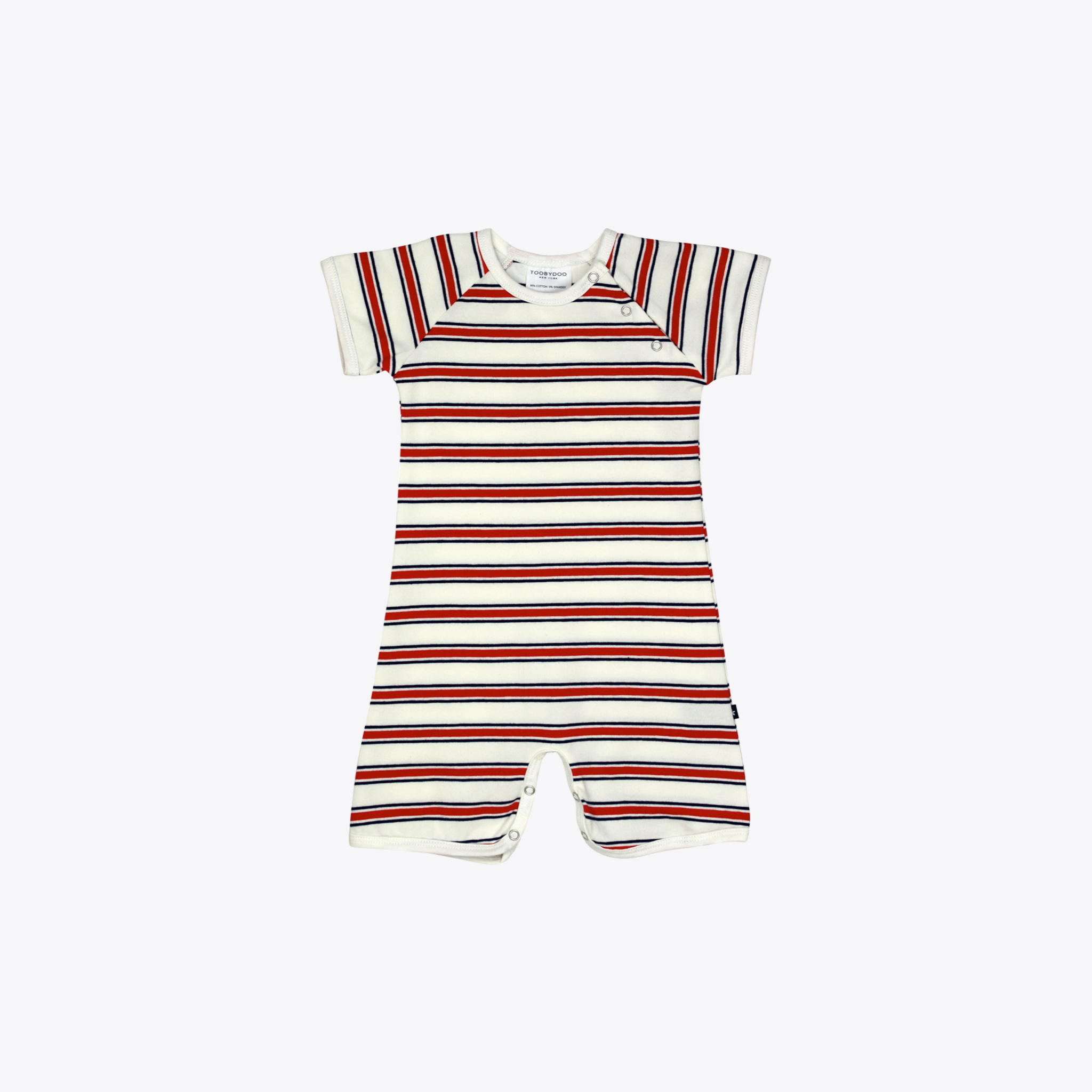 Short sleeve, short leg style jumpsuit in a stripe print with white background and thin navy and red stripes. Created in an ultra-soft cotton-spandex blend. Snap buttons at front and around inside of legs for easy dressing. Machine washable. Style # B10592