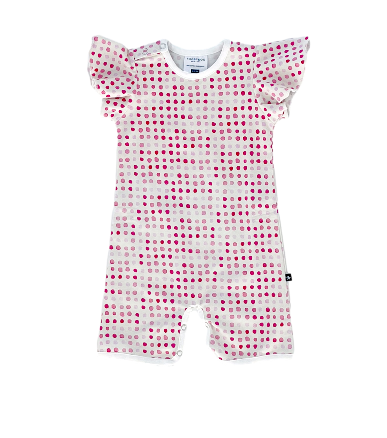 Short angel sleeve, short leg jumpsuit in a fun pink and white dot print. Created in an ultra-soft stretch blend. Snap buttons on shoulder and around inside of legs for easy dressing. Machine washable. Style # B10668