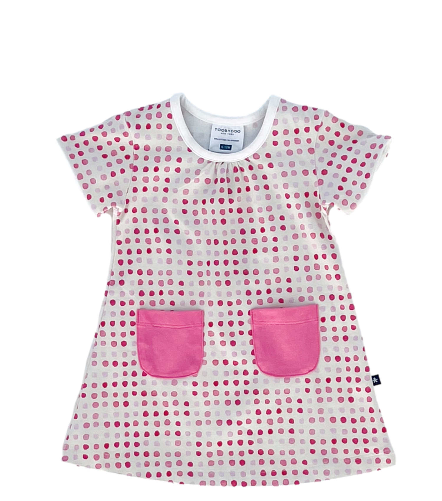 A splash of pink and white dots w/ 2 fun pink pockets. . Created in an ultra-soft stretch cotton blend. Baby sizes Include bloomers. Machine washable. Imported. Style # B10676