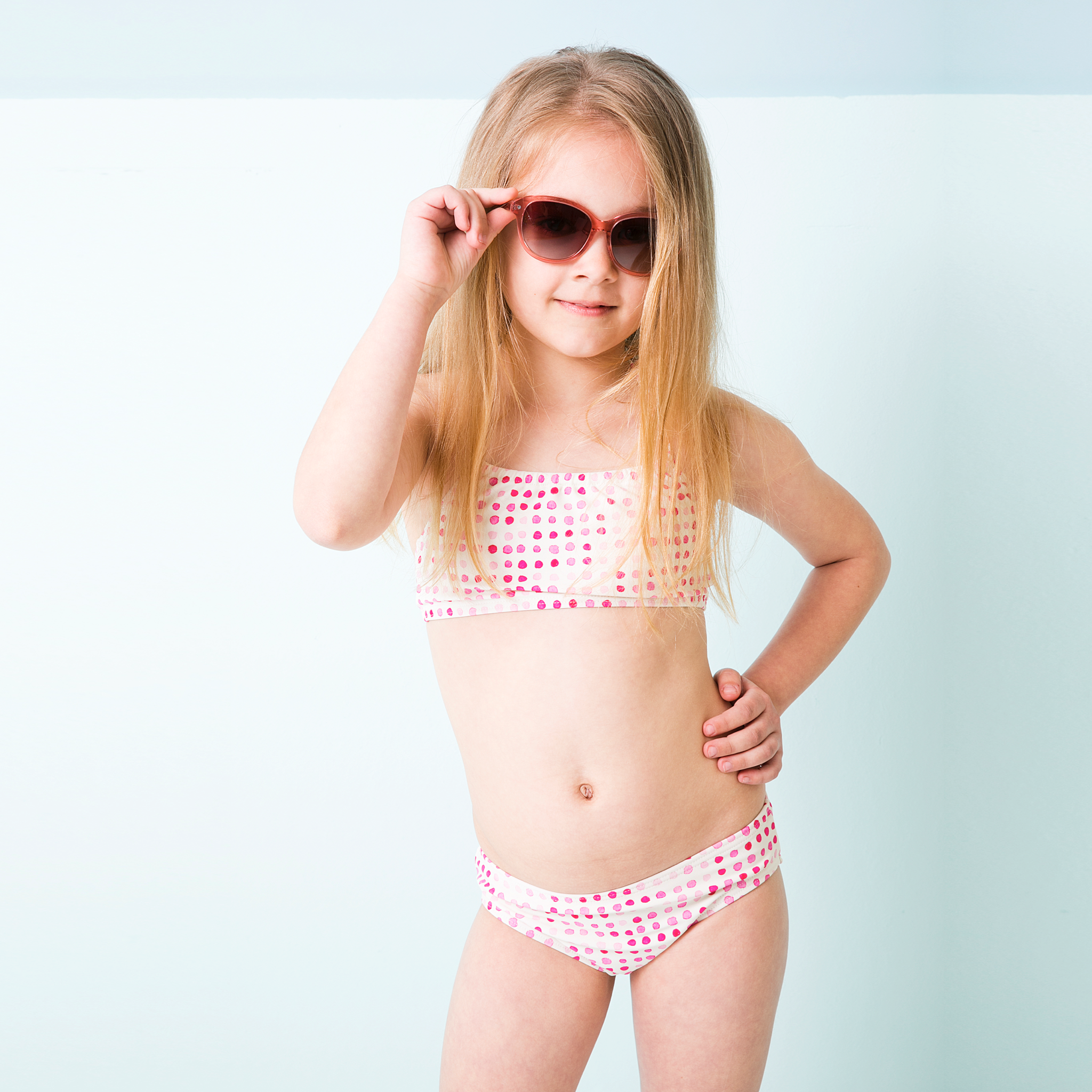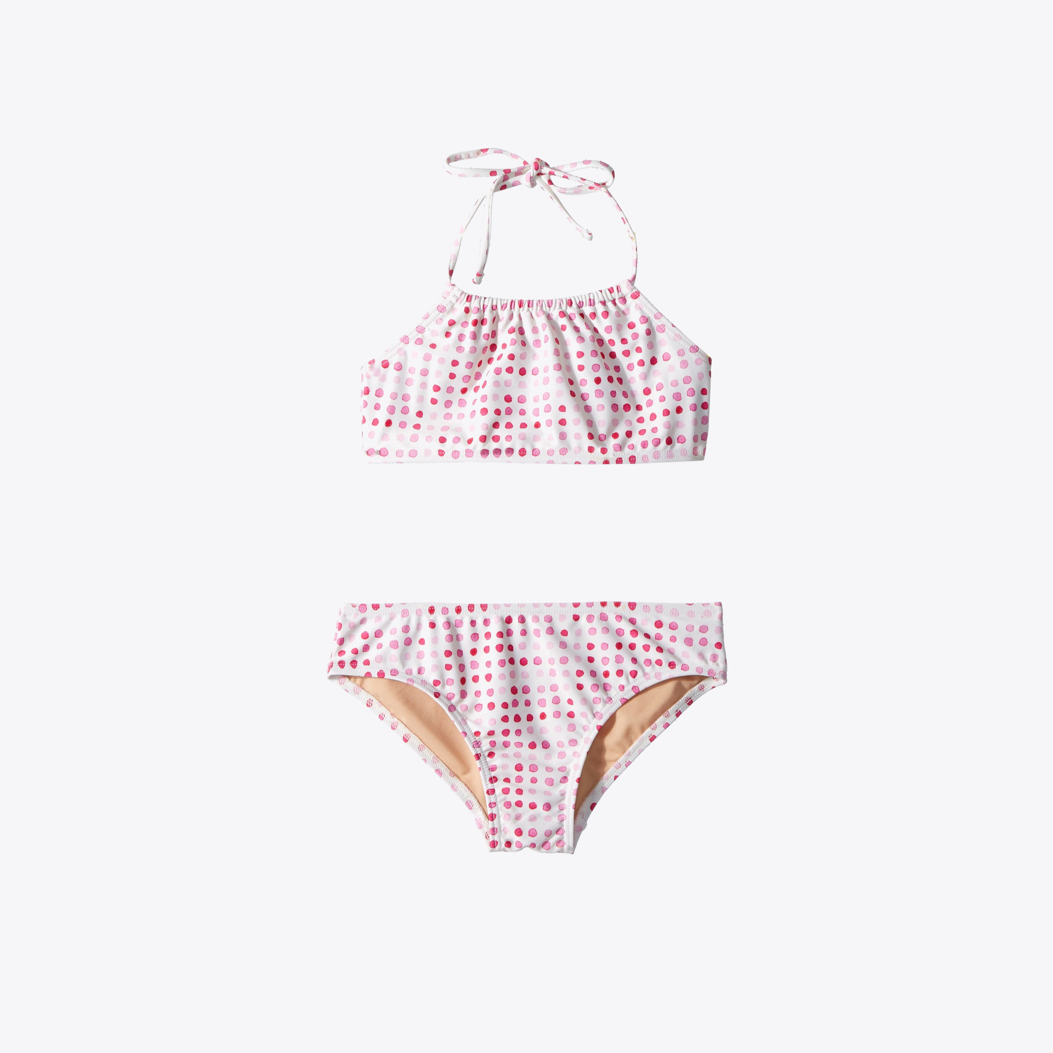 Halter top bikini with a halter tie around the neck and a tie at the back. Multi colored pink watercolor polka dots pattern. Full coverage bottom with a comfortable elastic waistband and a Toobydoo rubber logo attached at the back. Both pieces are fully lined. Shell created in 80% nylon and 20% spandex, lining in 92% polyester, 8% spandex. Machine wash cold. Style# S40078