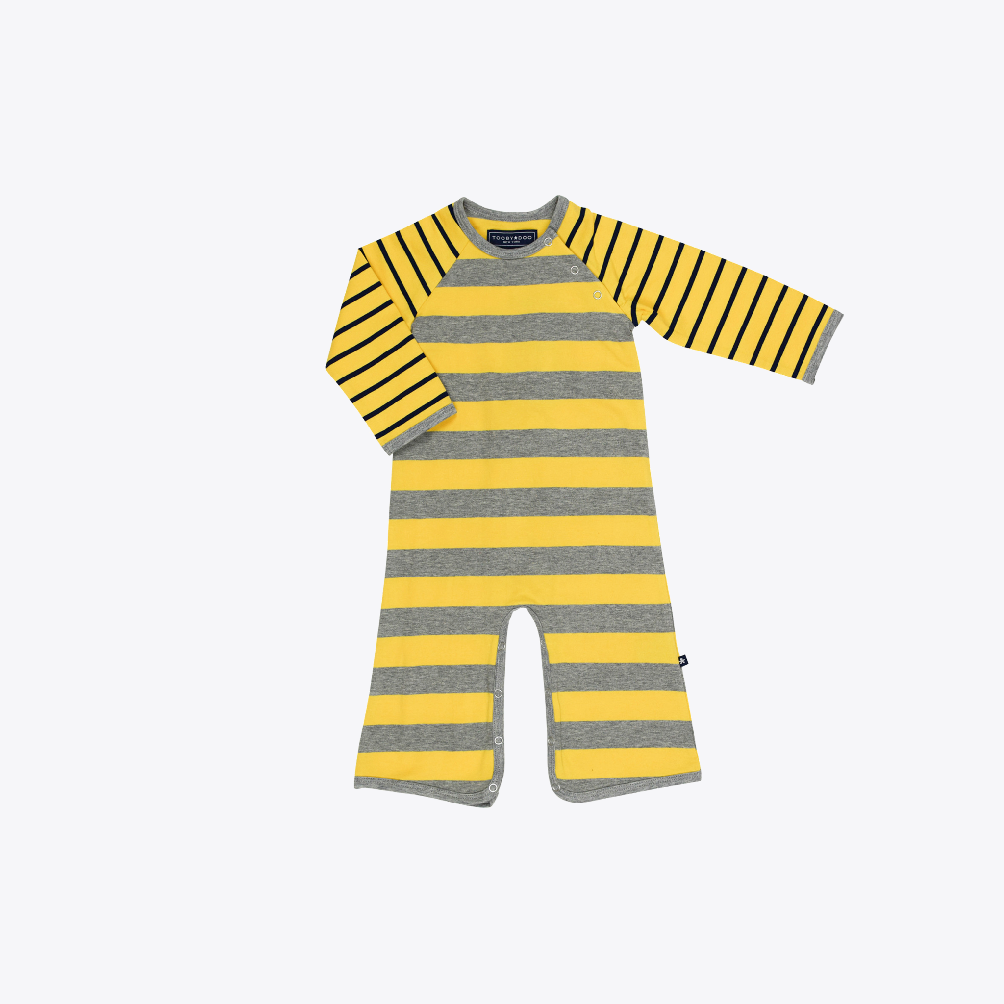 Signature boot cut style jumpsuit with industrial style metal snap buttons. Created in an ultra-soft stretch cotton blend for a comfortable fit. Luxury yarn-dye stripe. Heather grey and yellow stripe body with navy blue and yellow stripe arms. Machine washable. Style # B10280