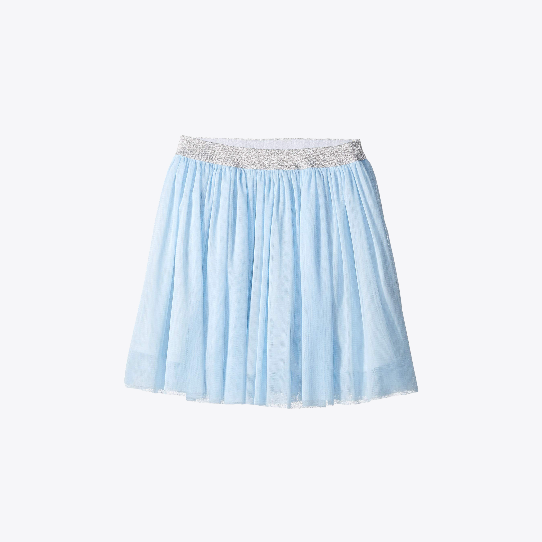 Fantastic light blue twirl tulle skirt with cotton lining. Silver sparkle elastic waist band. Machine washable. Style # M40091