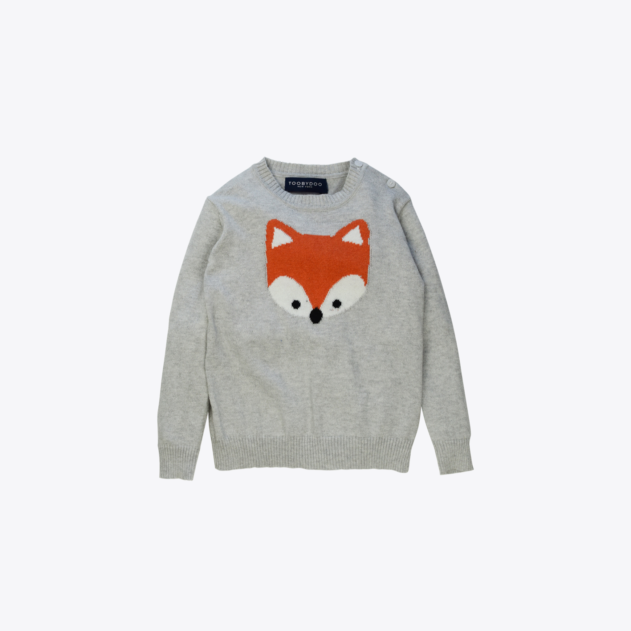 Baby sweater made in a cotton-cashmere blend featuring a cute fox! Ultra soft! Shoulder buttons for ease. Machine wash cold, lay flat to dry. 95% cotton, 7% cashmere. Style # B50005
