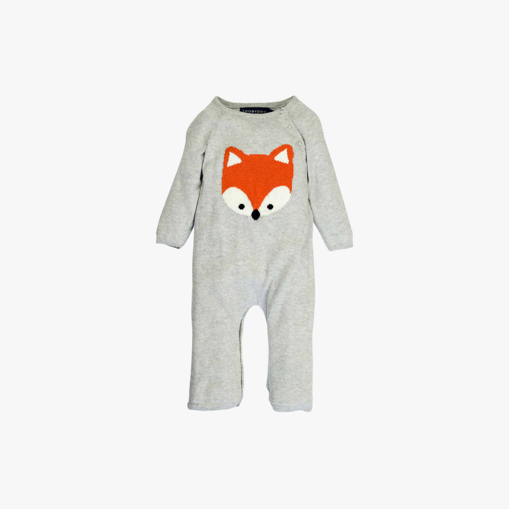 Fun grey fox jumpsuit! Signature boot cut style with industrial style metal snap buttons. Created in an ultra-soft cotton cashmere sweater knit or a comfortable fit. Machine washable. Style # B10502