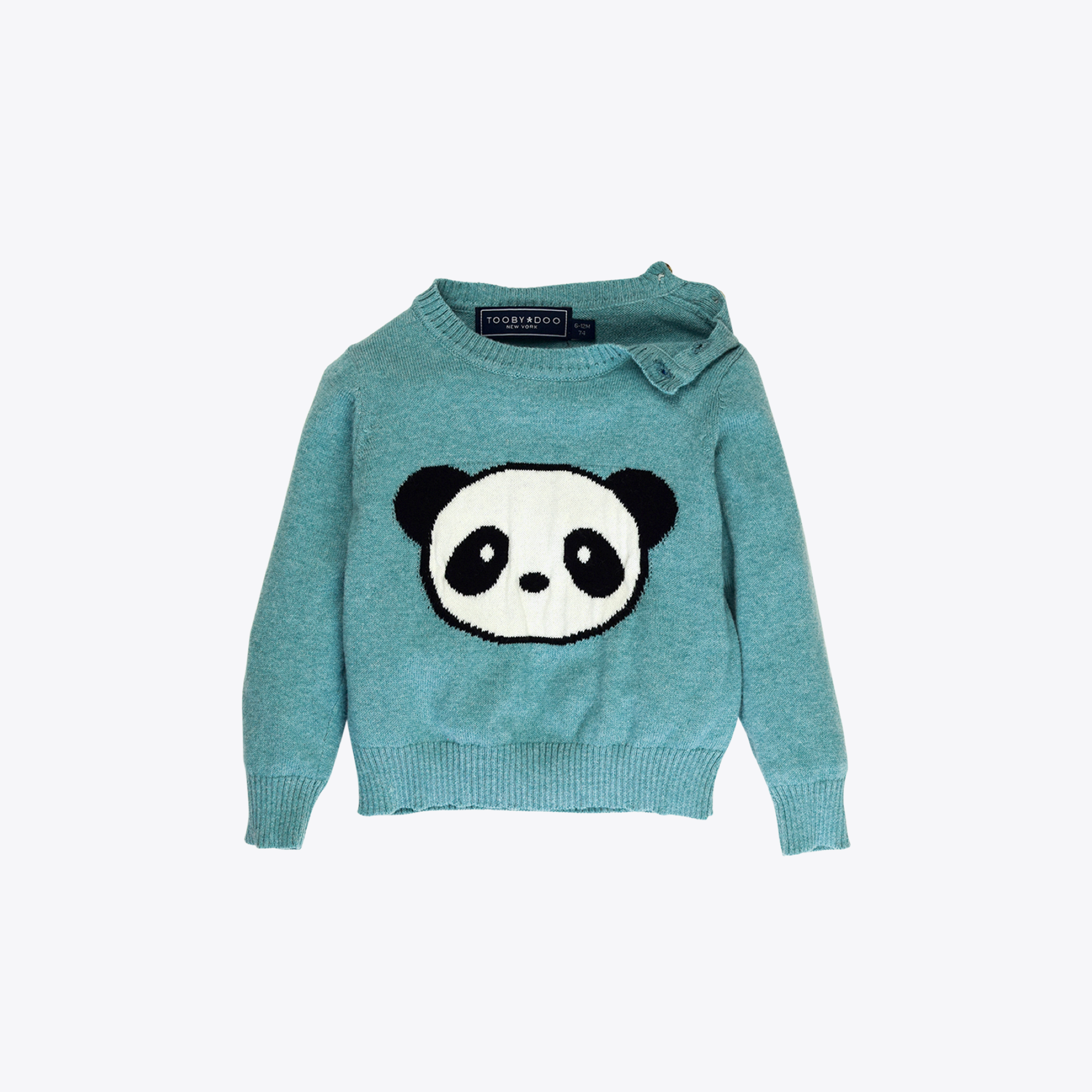 Baby sweater made in a cotton-cashmere blend featuring a cute panda! Beautiful heather teal color with natural white and black panda sewn in. Ultra soft! Mother of pearl buttons at shoulder for ease. Machine wash cold, lay flat to dry. 95% cotton, 7% cashmere. Style # B50010
