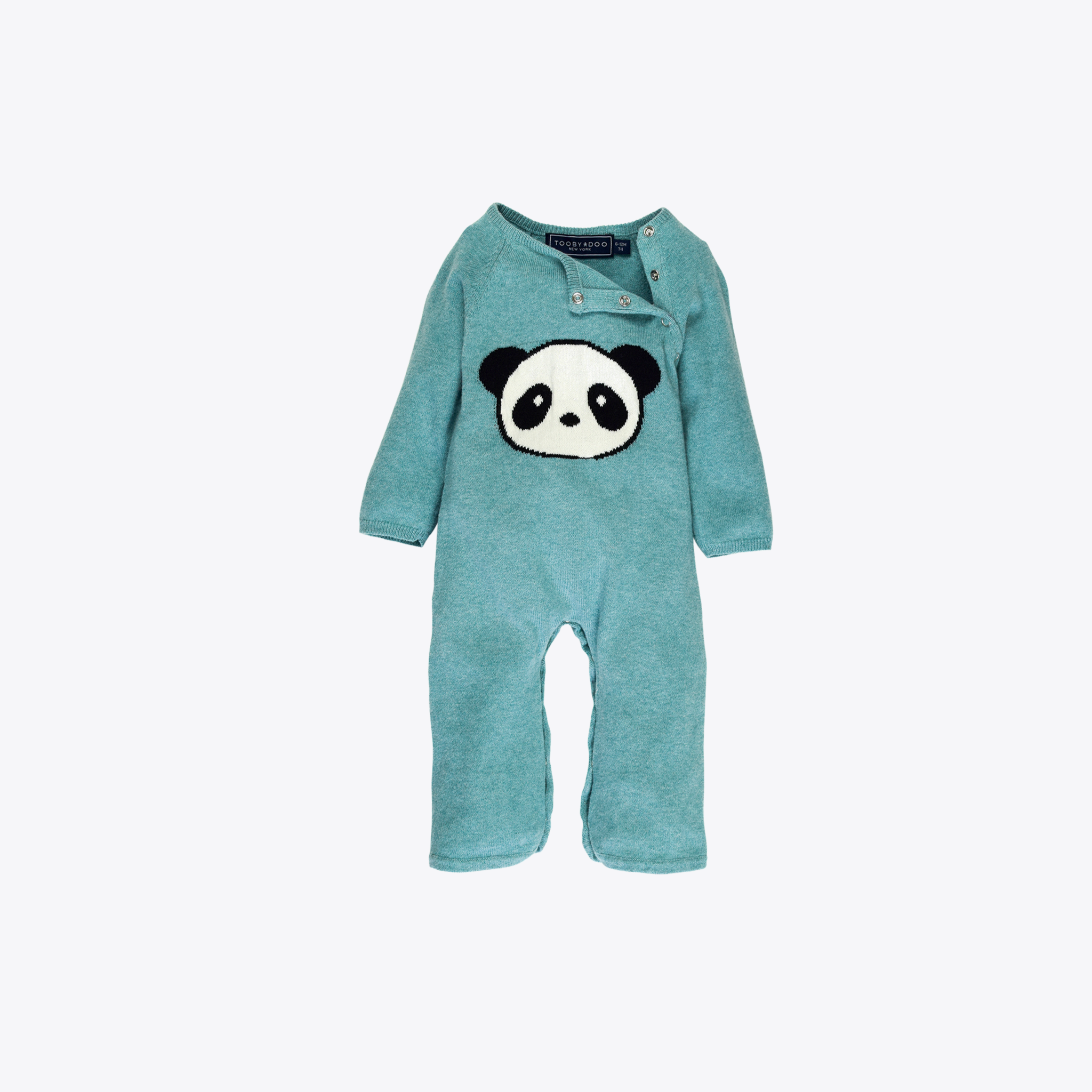 Signature boot cut style jumpsuit with industrial style metal snap buttons on chest and inside legs for easy dressing. Stunning heather aqua with natural white and black panda face on chest. Created in an ultra-soft cashmere blend for a comfortable fit (95% cotton, 5% cashmere). Luxury knit. Machine washable. Style # B10651
