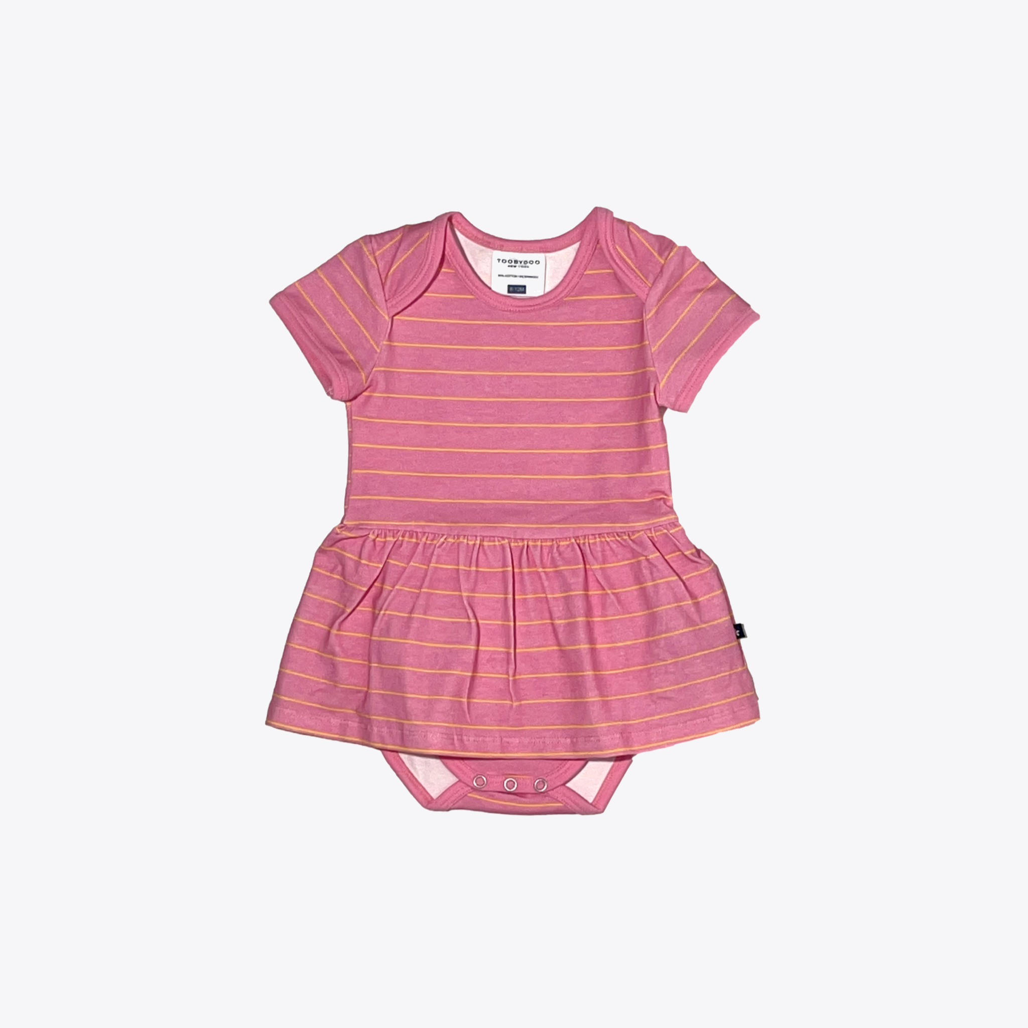 Cute baby sun dress in a fun pink yellow stripe. Envelope style neck opening with snap buttons at legs for easy dressing. Cute little sleeve to cover those shoulders. Created in a super soft luxury stretch cotton blend. Machine washable. Style # B10672