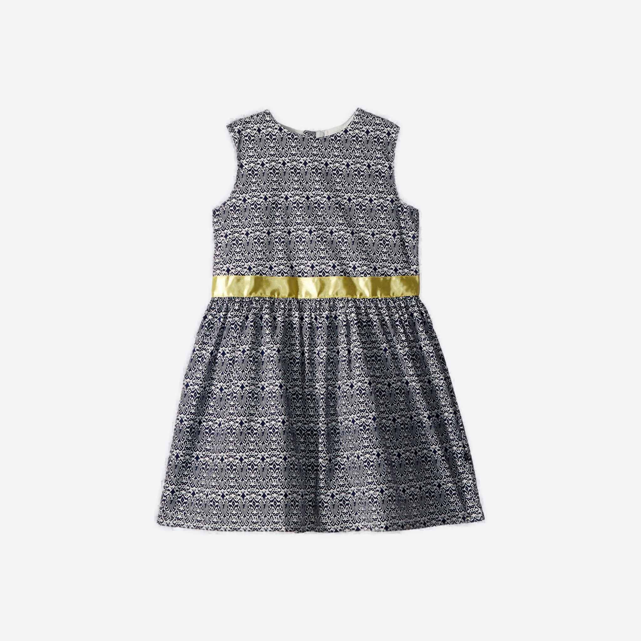 In style to the garden party. Sleeveless party dress with a ornate navy and white pattern with faux yellow satin belt. Zipper closure on back. Created in 100% woven cotton. Thin white cotton lining inside dress. Machine washable. Style # M20484