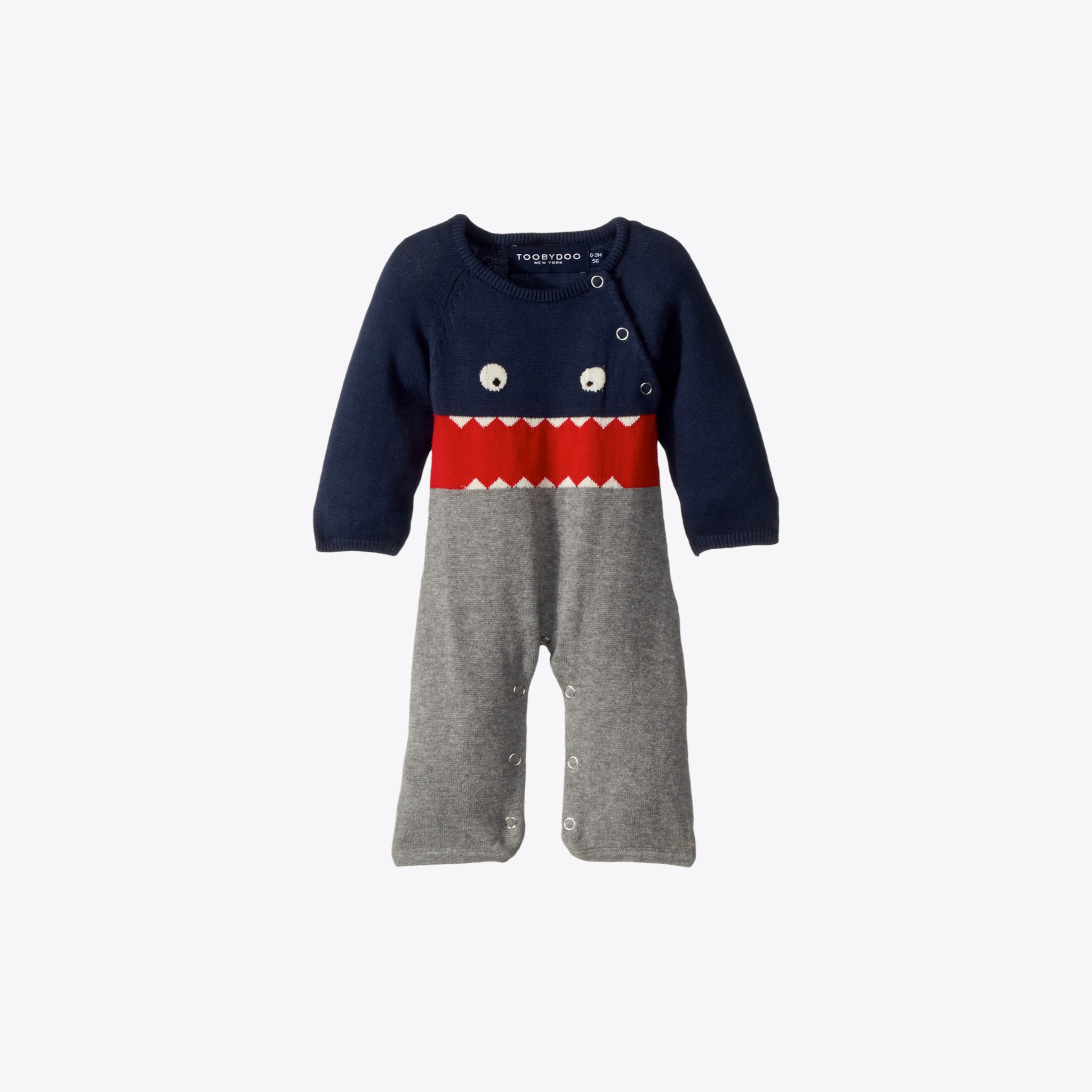 Meet friendly little monster Mikey. Mikey is always hungry, but - don't tell anyone! - milk is still his favorite! Also meet his friends Zoey and Pauley. Signature boot cut style jumpsuit with industrial style metal snap buttons across shoulder and inside of legs. Created in an ultra-soft, non-itchy 100% cotton sweater knit. Navy blue, red, heather grey and natural white. Machine washable. Style # B10365