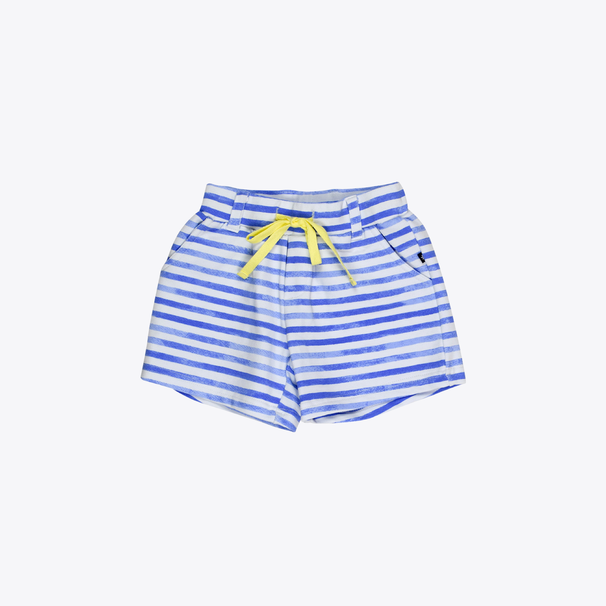 Designed for the hippest girl in town! The perfect mix & match item that goes with anything. Fun watercolor blue and white stripe with a contrasting bright yellow drawstring. Large front pockets. Wide elastic waist band and drawstring for a comfortable fit. Created in a soft French terry cotton. Faux back pockets and faux zipper flap. Machine washable. Style # M40083