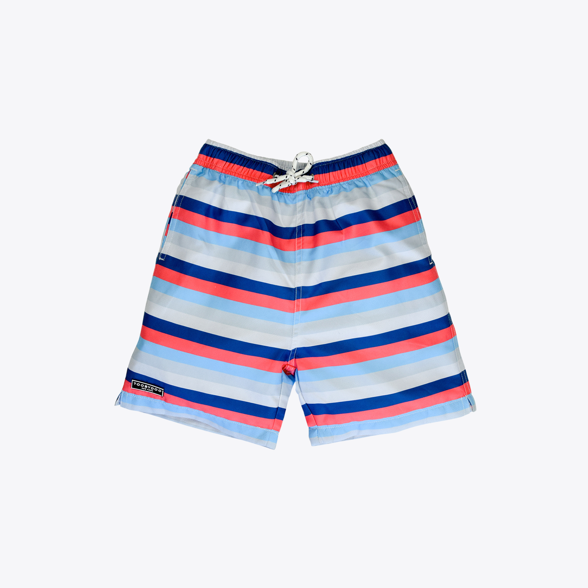 Luxury board shorts with signature Toobydoo race stripe print. Features an elastic waist band, sailor style drawstring, side pockets, full mesh lining, back pockets with velcro closure, special eyelets for rapid air evacuation. Shorts have a cotton feel and are quick drying (100% polyamide). Style # S20144